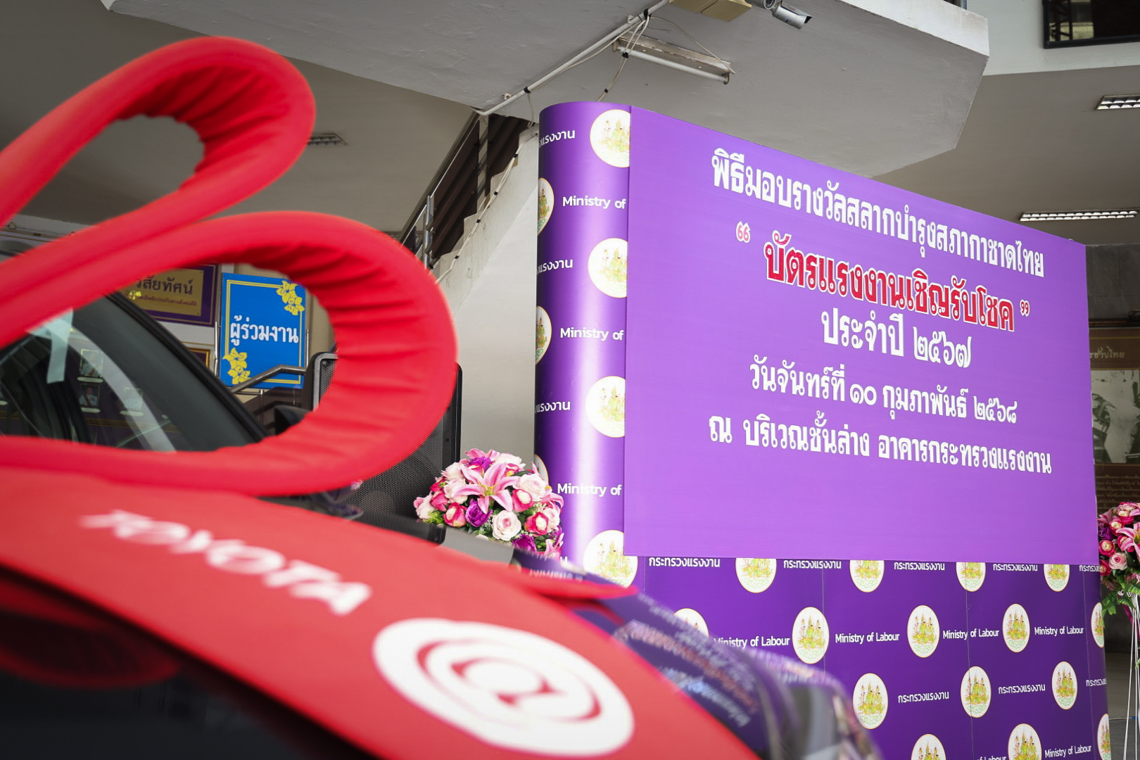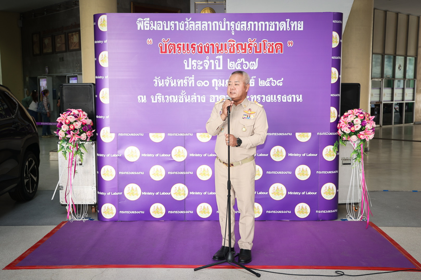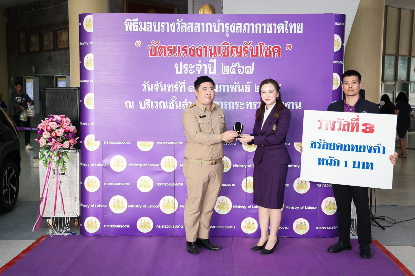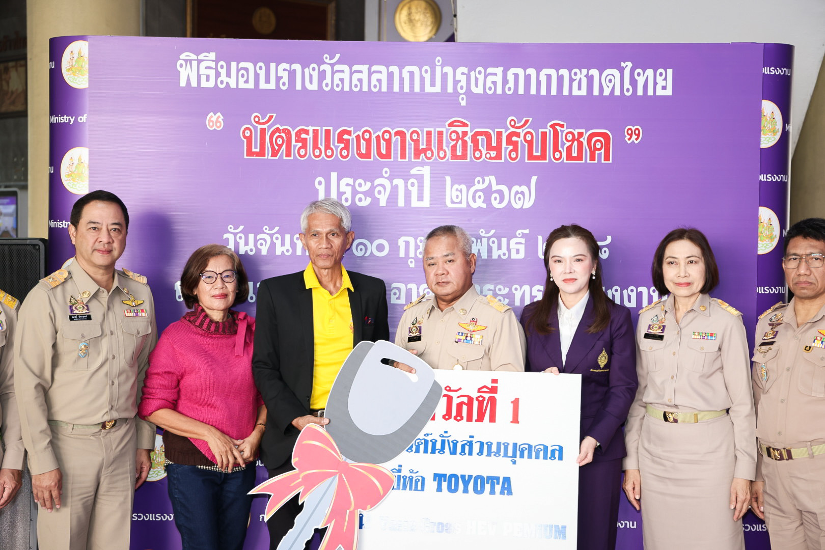 วันที่ 10 กุมภาพันธ์ 2568 เวลา 11.00 น.นายบุญสงค์ ทัพชัยยุทธ์ ปลัดกระทรวงแรงงาน เป็นประธานในพิธีมอบรางวัลใหญ่ รถยนต์นั่งส่วนบุคคลยี่ห้อ TOYOTA รุ่น Yaris Cross HEV PEMIUM จำนวน 1 คัน ให้แก่ นายส่งเสริม สุขวัฒน์ ครูฝึกฝีมือแรงงาน ลูกจ้างประจำ สถาบันพัฒนาฝีมือแรงงาน 2 สุพรรณบุรี พร้อมด้วย นางสาวเทียมแข ทัพชัยยุทธ์ นายกสมาคมแม่บ้านกระทรวงแรงงาน มอบรางวัลที่ 3 สร้อยคอทองคำหนัก 1 บาท แก่ นายณัฐพล หาจันดา ข้าราชการ สังกัดศูนย์วิจัยและนวัฒกรรมแรงงาน กองเศรษฐกิจการแรงงาน สำนักงานปลัดกระทรวงแรงงาน ผู้โชคดีที่ร่วมทำบุญกุศลอุดหนุนสลากบำรุงสภากาชาดไทย “บัตรแรงงานเชิญรับโชค” ประจำปี 2567 ซึ่งกระทรวงแรงงาน ร่วมกับ สมาคมแม่บ้านกระทรวงแรงงานจัดขึ้น โดยมี นายสมาสภ์ ปัทมะสุคนธ์ รองปลัดกระทรวงแรงงาน นายสันติ นันตสุวรรณ ผู้ตรวจราชการกระทรวงแรงงาน รักษาราชการแทน รองปลัดกระทรวงแรงงาน นายณัฐวุฒิ ภัทรประยูร จัดหางานจังหวัดร้อยเอ็ด รักษาการในตำแหน่งที่ปรึกษาวิชาการแรงงาน นางสาวกรจิรัฏฐ์ พงจันทร์ศธร ผู้ช่วยปลัดกระทรวงแรงงาน นายศักดินาถ สนธิศักดิ์โยธิน ผู้ช่วยปลัดกระทรวงแรงงาน พร้อมด้วย ผู้บริหารระดับสูงกระทรวงแรงงาน ร่วมเป็นเกียรติและสักขีพยานด้วย ณ บริเวณโถงชั้นล่าง อาคารกระทรวงแรงงาน