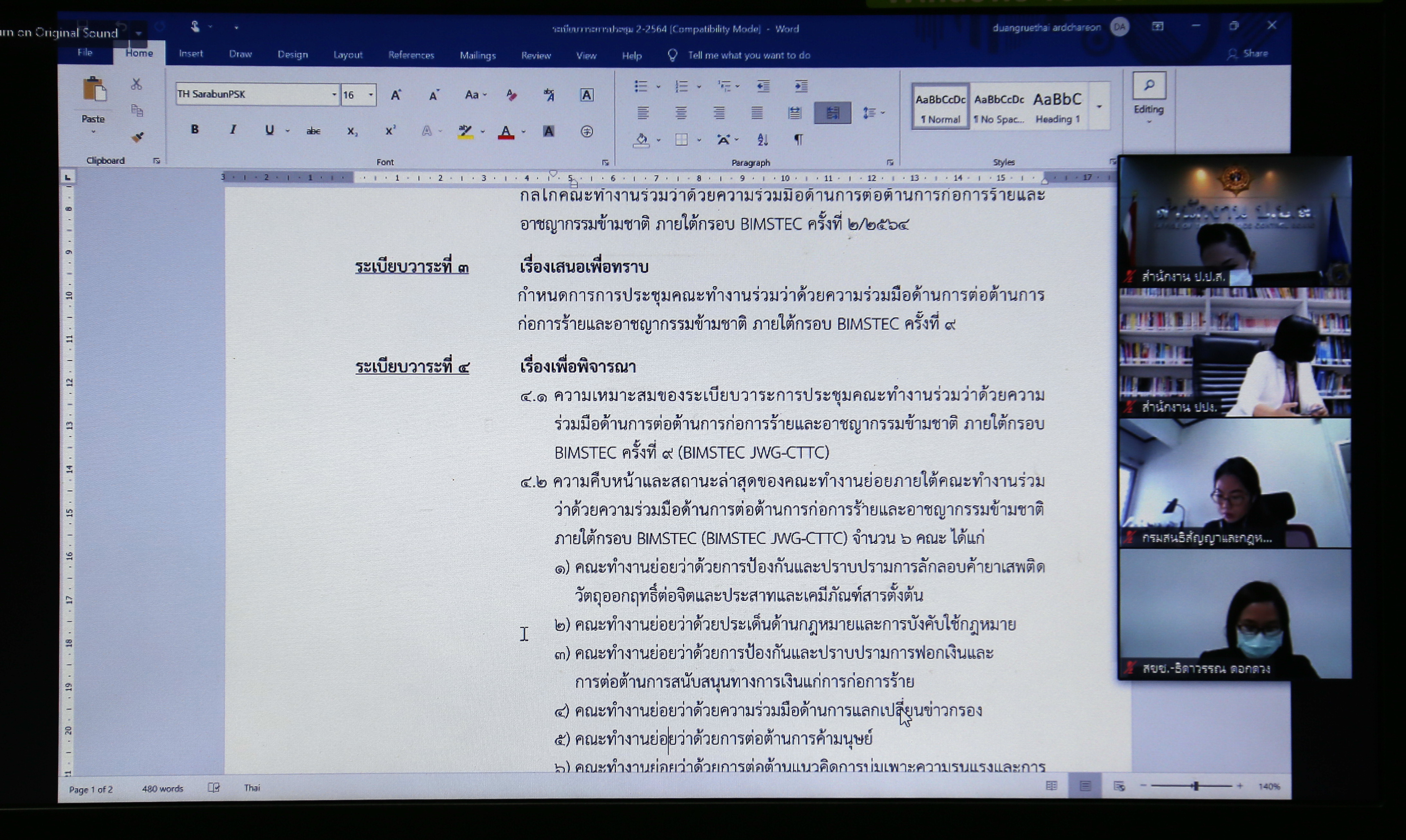 วันที่ 16 พฤศจิกายน 2564 เวลา 09.30 น. นางต้องใจ สุทัศน์ ณ อยุธยา ผู้ช่วยปลัดกระทรวงแรงงาน ร่วมการประชุมคณะกรรมการความร่วมมือด้านความมั่นคงของกลไกคณะทำงานร่วมว่าด้วยความร่วมมือด้านการต่อต้านการก่อการร้ายและอาชญากรรมข้ามชาติ ภายใต้กรอบ BIMSTEC ครั้งที่ 2/2564 ผ่านระบบ Zoom ณ ห้องทำงานผู้ช่วยปลัดกระทรวงแรงงาน ชั้น 7 อาคารกระทรวงแรงงาน