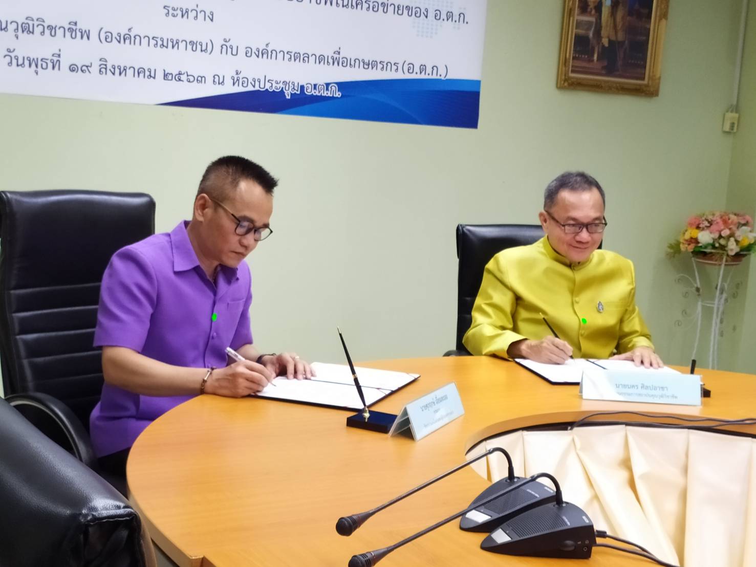 วันที่ 19 สิงหาคม 2563 เวลา 09.00 น. นายสุทธิ สุโกศล ปลัดกระทรวงแรงงาน มอบหมายให้ นางสาวอำพันธ์ ธุววิทย์ รองปลัดกระทรวงแรงงาน เข้าร่วมในพิธีลงนามบันทึกข้อตกลงความร่วมมือ “การพัฒนาผู้ประกอบอาชีพในเครือข่ายขององค์การตลาดเพื่อการเกษตร” ระหว่าง สถาบันคุณวุฒิวิชาชีพ (องค์การมาชน) โดยนายนคร ศิลปอาชา ประธาน กรรมการสถาบันคุณวุฒิวิชาชีพ กับ องค์การตลาดเพื่อการเกษตร (อ.ต.ก.) โดย นายศุภฤกษ์ เอี่ยมลออ กรรมการ อ.ต.ก. รักษาราชการแทนตำแหน่งผู้อำนวยการองค์การตลาดเพื่อการเกษตร ทั้งนี้เพื่อสนับสนุนให้มีการประเมินสมรรถนะของบุคคลตามมาตรฐานอาชีพและคุณวุฒิวิชาชีพ ตลอดจนผลักดันให้เกิดการพัฒนาหลักสูตรฐานสมรรถนะด้วยมาตรฐานอาชีพและคุณวุฒิวิชาชีพ เพื่อสร้างโอกาสและเสริมสร้างขีดความสามารถในการทำงานให้เป็นมืออาชีพ ณ ห้องประชุม อตก.กรุงเทพฯ