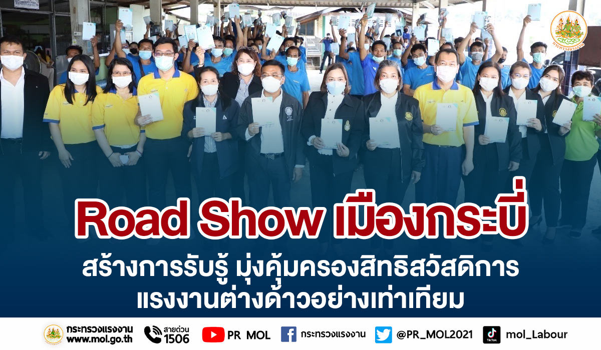 วันที่ 22 มีนาคม 2566 กระทรวงแรงงาน โดยกองเผยแพร่และประชาสัมพันธ์ สำนักงานปลัดกระทรวงแรงงาน จัดกิจกรรมออกหน่วยประชาสัมพันธ์เคลื่อนที่ (Road Show) ตามโครงการประชาสัมพันธ์เพื่อสร้างการรับรู้ และความเข้าใจนโยบายการบริหารจัดการ การนำเข้า ป้องกันและคุ้มครองสิทธิแรงงานต่างด้าวของกระทรวงแรงงานและรัฐบาล เพื่อสร้างการรับรู้เรื่องสิทธิของแรงงานต่างด้าว ภายใต้กรอบแนวคิด “แรงงานต่างด้าวและแรงงานไทยได้รับการดูแลอย่างเท่าเทียม” เพื่อส่งเสริมให้นายจ้างสถานประกอบการจ้างแรงงานต่างด้าวถูกกฎหมาย โดยมี พ.อ.สมบัติ สืบท้วม รอง ผอ.กอ.รมน.จังหวัด ก.บ.(ท.) เป็นประธานกล่าวเปิดงาน นางนิรมล หมื่นจิตร แรงงานจังหวัดกระบี่ กล่าวรายงานวัตถุประสงค์การจัดงาน นายสวัสดิ์ พลวัฒนกุล ผู้จัดการโรงงาน นายภัทรพงศ์ ทองด้วง ผู้จัดการฝ่ายบุคคล บริษัท ไทยแมคเอสทีอาร์ จำกัด สาขากระบี่ 2 พร้อมด้วยหัวหน้าส่วนราชการหน่วยงานสังกัดกระทรวงแรงงานจังหวัดกระบี่ และลูกจ้างแรงงานต่างด้าว ร่วมให้การต้อนรับ ณ บริษัท ไทยแมคเอสทีอาร์ จำกัด ตั้งอยู่เลขที่ 338 หมู่ที่ 1 ต.เขาคราม อ.เมืองกระบี่ จ.กระบี่ ซึ่งเป็นสถานประกอบกิจการประเภทกิจการต่อเนื่องการเกษตร การผลิตยางแผ่นรมควันส่งสินค้าให้บริษัทผลิตยางรถชั้นน้ำหลายยี่ห้อ มีการจ้างงานแรงงาน ทั้งสิ้นจำนวน 210 คน สัญชาติไทย 120 คน แรงงานต่างด้าวสัญชาติเมียนมา 90 คน