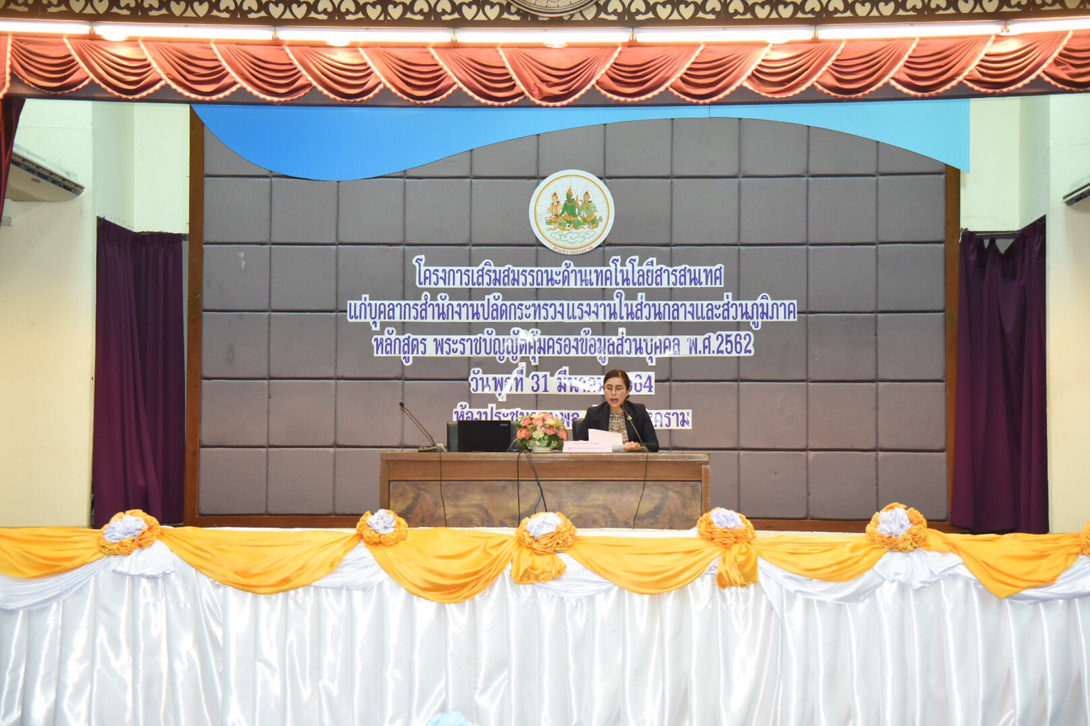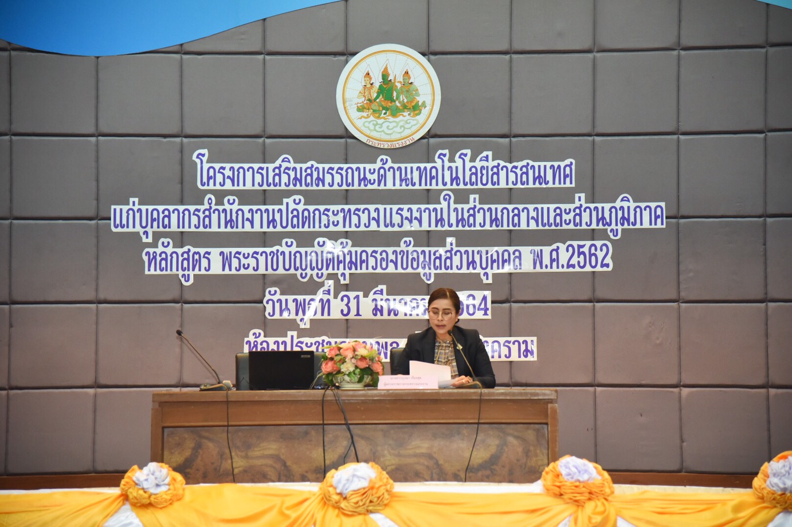 วันที่ ๓๑ มีนาคม ๒๕๖๔ เวลา ๑๓.๑๕ น. นาย สุทธิ สุโกศล ปลัดกระทรวงแรงงาน มอบหมายให้ นางสาว บุปผา เรืองสุด ผู้ตรวจราชการกระทรวงแรงงาน เป็นประธานในพิธีเปิดโครงการเสริมสมรรถนะด้านเทคโนโลยีสารสนเทศแก่บุคลากรสำนักงานปลัดกระทรวงแรงงาน ในส่วนกลางและส่วนภูมิภาค หลักสูตร พระราชบัญญัติคุ้มครองข้อมูลส่วนบุคคล พ.ศ. ๒๕๖๔ ณ ห้องประชุมจอมพล ป.พิบูลสงคราม ชั้น ๕ กระทรวงแรงงาน