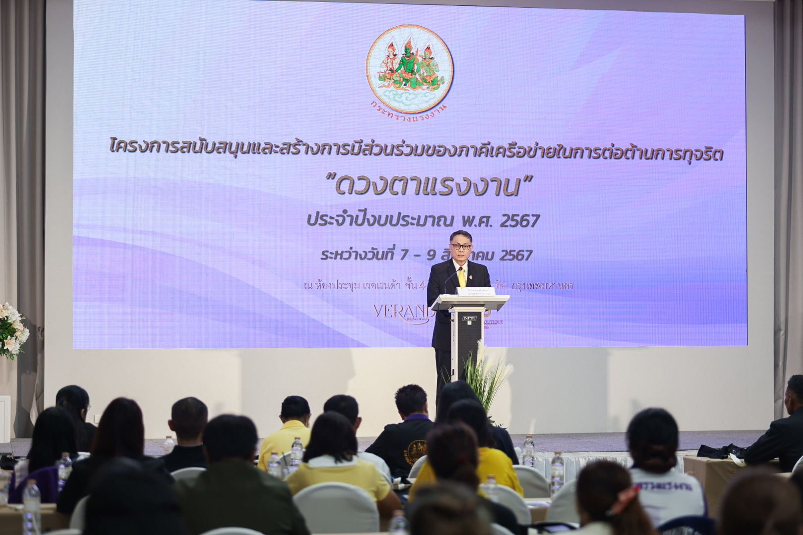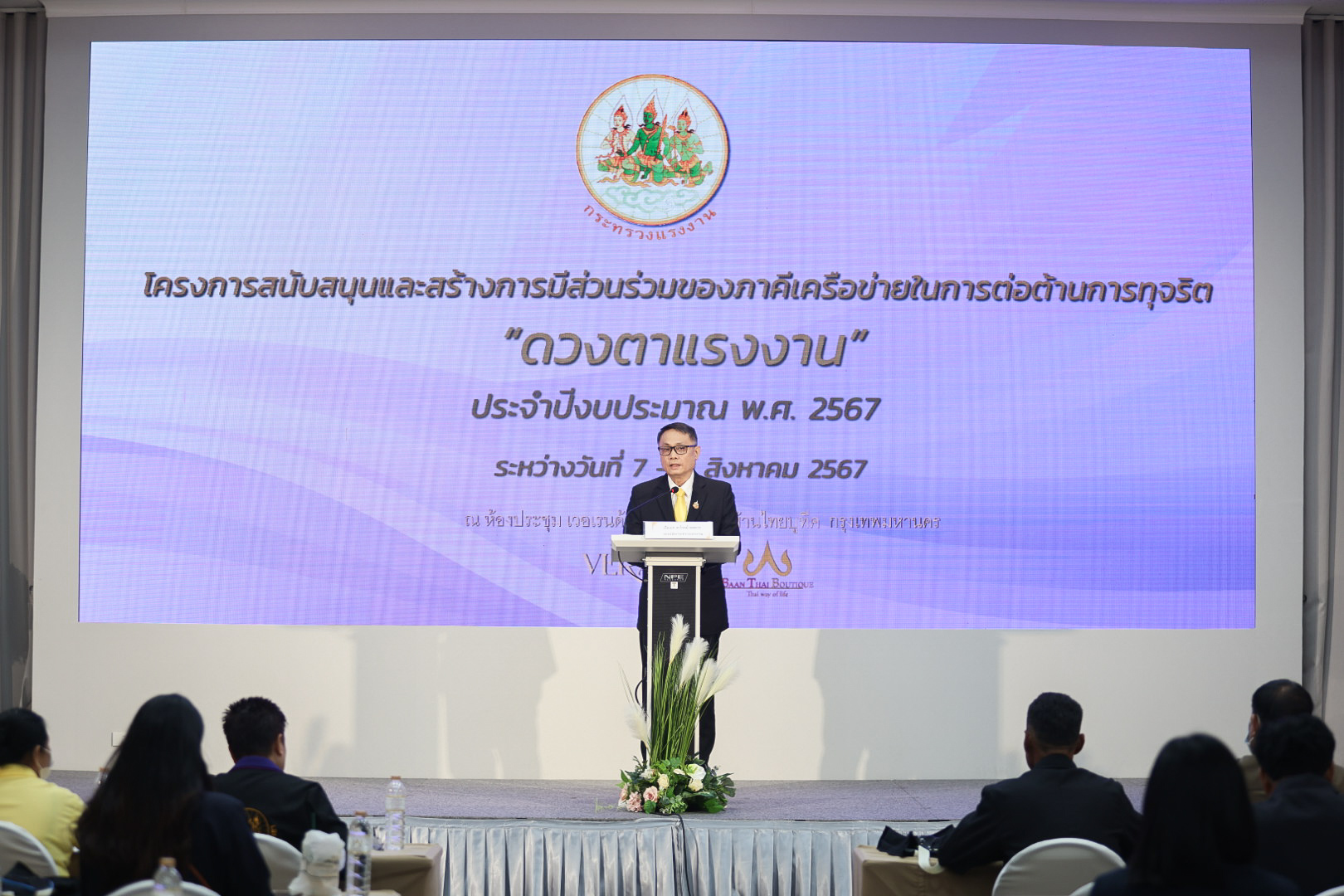 วันที่ 7 สิงหาคม 2567 เวลา 10.30 น. นายไพโรจน์ โชติกเสถียร ปลัดกระทรวงแรงงาน มอบหมายให้ เรือเอก สาโรจน์ คมคาย รองปลัดกระทรวงแรงงาน เป็นประธานในพิธีเปิดโครงการสนับสนุนและสร้างการมีส่วนร่วมของภาคีเครือข่ายในการต่อต้านการทุจริต “ดวงตาแรงงาน” ประจำปีงบประมาณ พ.ศ. 2567 โดยมี ข้าราชการ เจ้าหน้าที่สำนักงานแรงงานจังหวัด อาสาสมัครแรงงานและเครือข่ายภาคประชาชน ในภาคเหนือ ซึ่งเป็นผู้เข้ารับการอบรมและเจ้าหน้าที่ศูนย์ปฏิบัติการต่อต้านการทุจริต กระทรวงแรงงาน ร่วมให้การต้อนรับ ณ โรงแรม บ้านไทย บูทีค กรุงเทพฯ