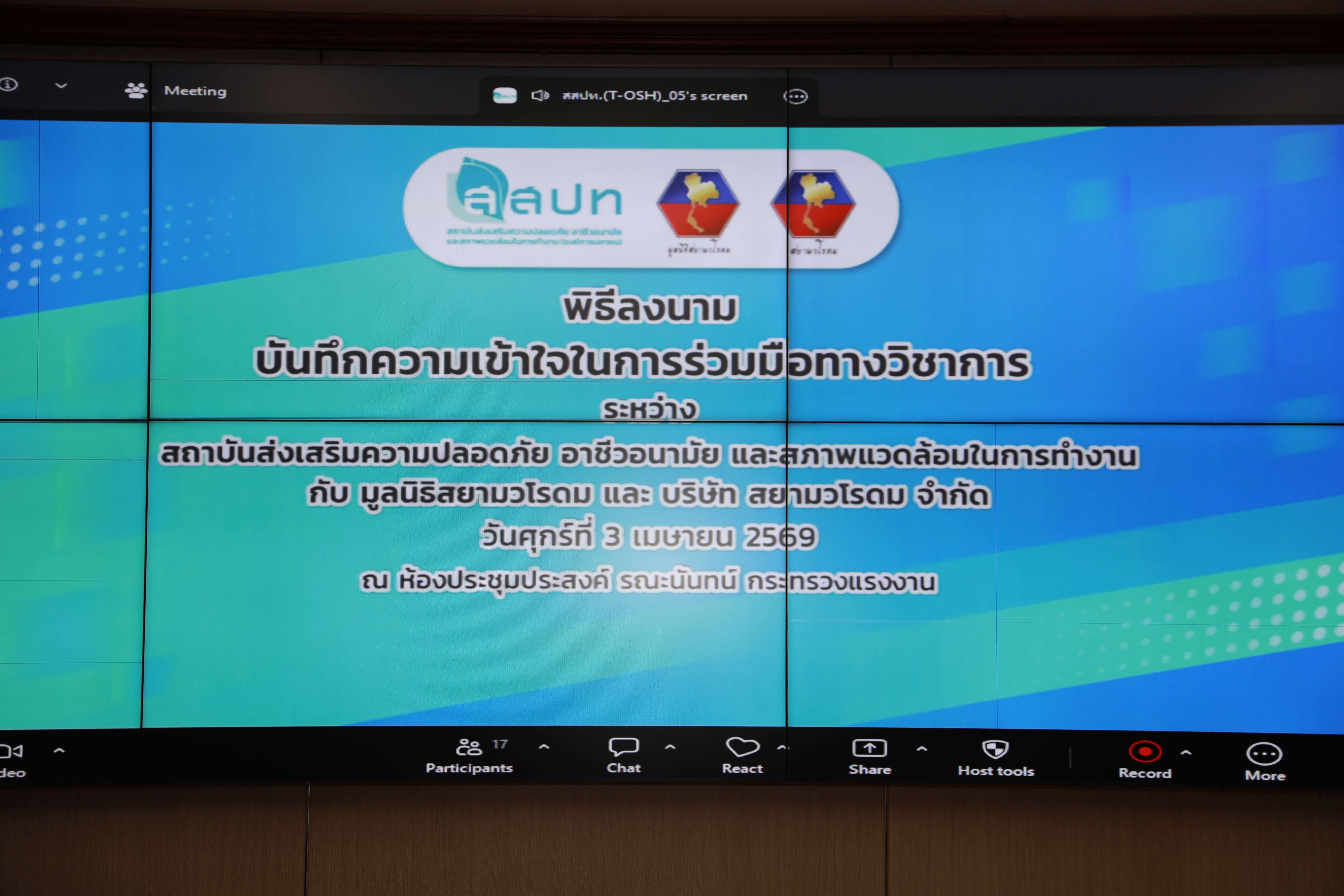 วันที่ 3 เมษายน 2569 เวลา 09.30 น. พันตำรวจโท วรรณพงษ์ คชรักษ์ ปลัดกระทรวงแรงงาน ให้เกียรติเป็นประธานสักขีพยานพิธีลงนาม MOU ระหว่างสถาบันส่งเสริมความปลอดภัย อาชีวอนามัย และสภาพแวดล้อมในการทำงาน (องค์การมหาชน) กับมูลนิธิสยามวโรดม และบริษัท สยามวโรดม จำกัด เพื่อขับเคลื่อนโครงการพัฒนาศูนย์ความปลอดภัยและมาตรฐานองค์กรความปลอดภัยทางถนน (OSH & Road Safety Excellence Center) โดยมี นายนันทชัย ปัญญาสุรฤทธิ์ ผู้อำนวยการสถาบันส่งเสริมความปลอดภัย อาชีวอนามัย และสภาพแวดล้อมในการทำงาน (องค์การมหาชน) กล่าวรายงาน ดร.บุษรา วงศ์รักศักดิ์ ประธานมูลนิธิสยามวโรดม ดร.บุษรา ทองอินทร์ กรรมการ บริษัท สยามวโรดม จำกัด ผู้บริหารสถานประกอบการ และเจ้าหน้าที่หน่วยงานที่เกี่ยวข้อง ร่วมเป็นเกียรติ ณ ห้องประชุมประสงค์ รณะนันทน์ ชั้น 5 อาคารกระทรวงแรงงาน