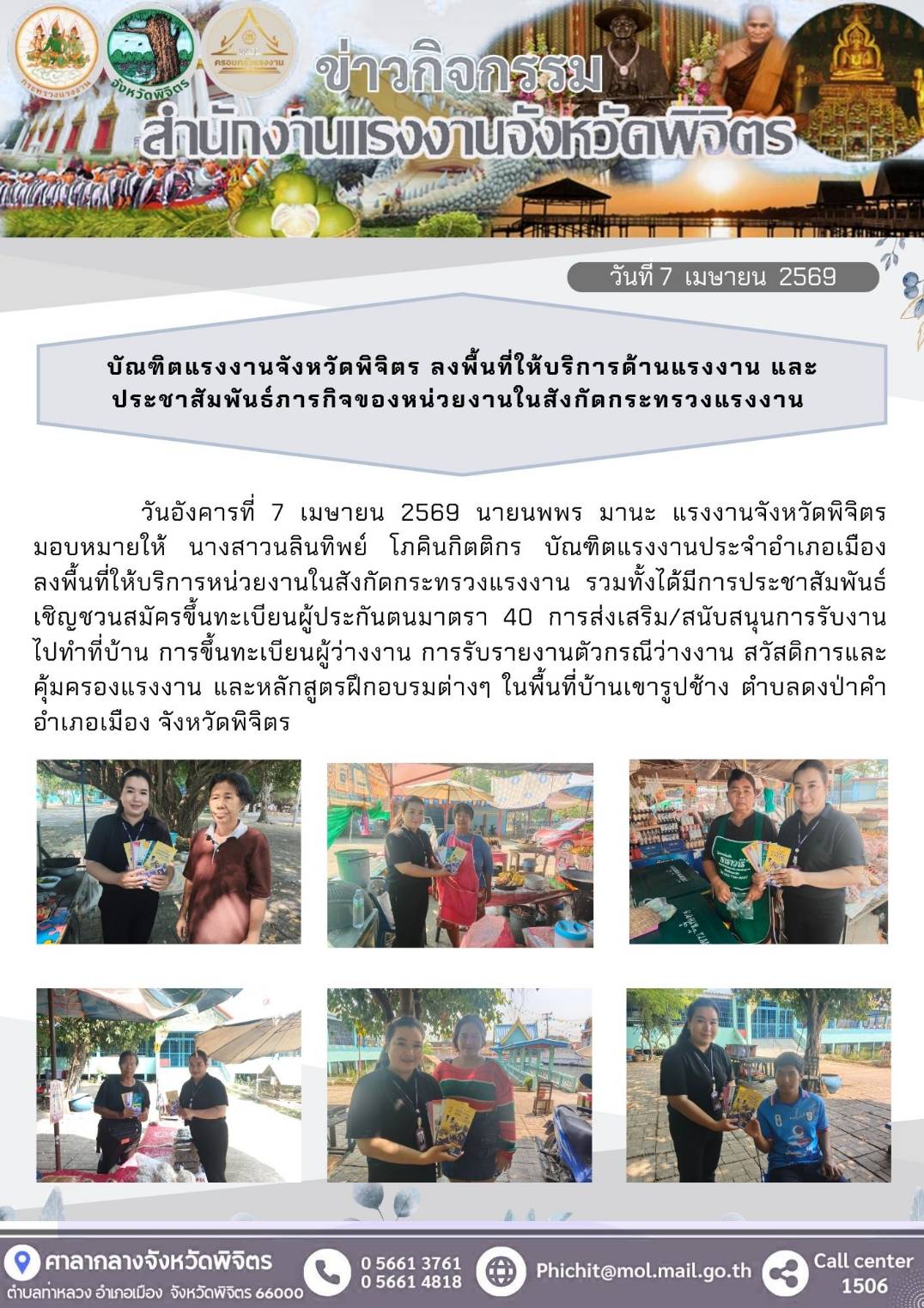 บัณฑิตแรงงานจังหวัดพิจิตร ลงพื้นที่ประชาสัมพันธ์ให้บริการด้านแรงงานของหน่วยงานในสังกัดกระทรวงแรงงาน
