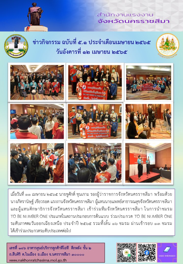 เมื่อวันที่ 11 เมษายน 2565 นายชูศักดิ์ ชุนเกาะ รองผู้ว่าราชการจังหวัดนครราชสีมา พร้อมด้วย นางภัทรานิษฐ์ เขียวรอด แรงงานจังหวัดนครราชสีมา ผู้แทนนายแพทย์สาธารณสุขจังหวัดนครราชสีมา และผู้แทนศึกษาธิการจังหวัดนครราชสีมา เข้าร่วมทีมจังหวัดนครราชสีมา ในการนำชมรม TO BE NUMBER ONE ประเภทในสถานประกอบการต้นแบบ ร่วมประกวด TO BE NUMBER ONE ระดับภาคตะวันออกเฉียงเหนือ ประจำปี 2565 รวมทั้งสิ้น 16 ชมรม ผ่านเข้ารอบ 13 ชมรม ได้เข้าร่วมประกวดระดับประเทศต่อไป