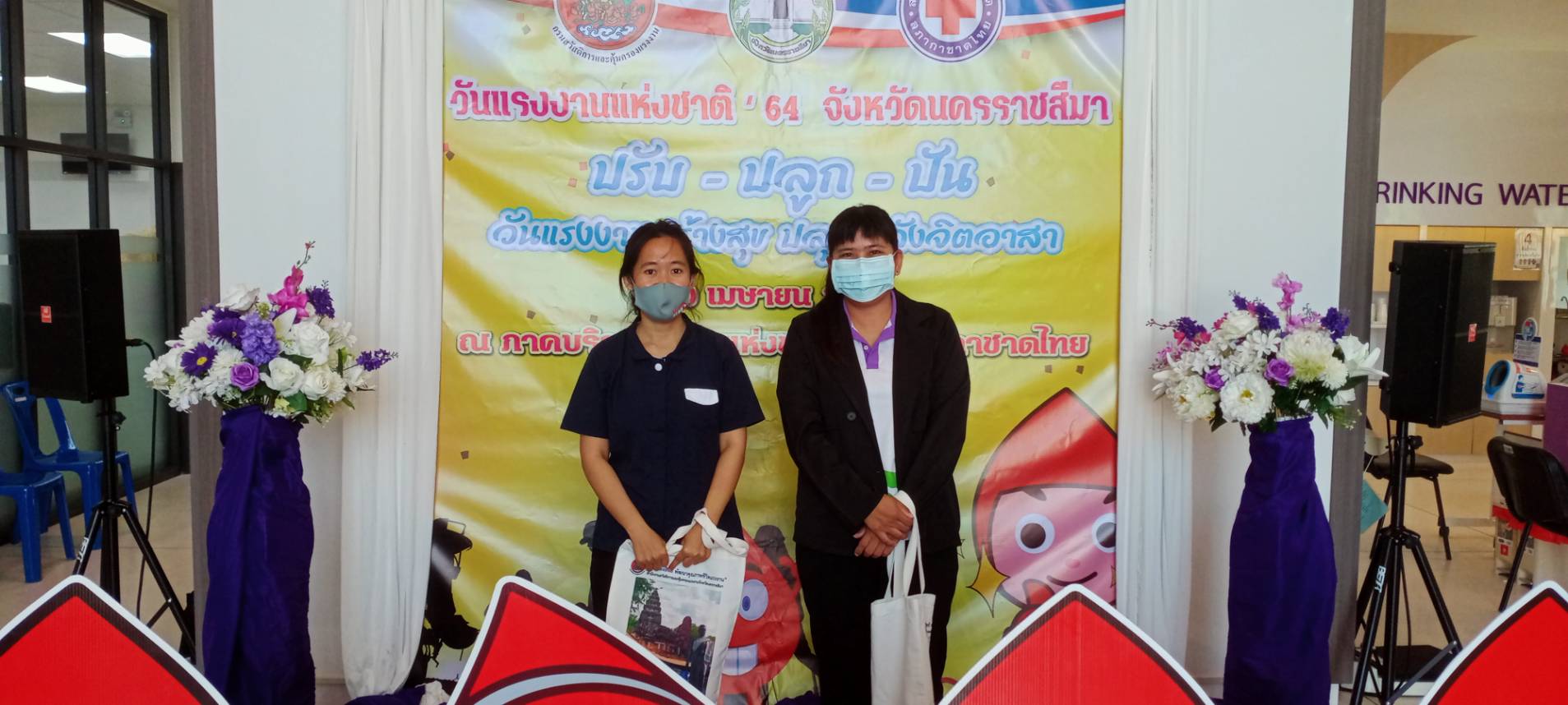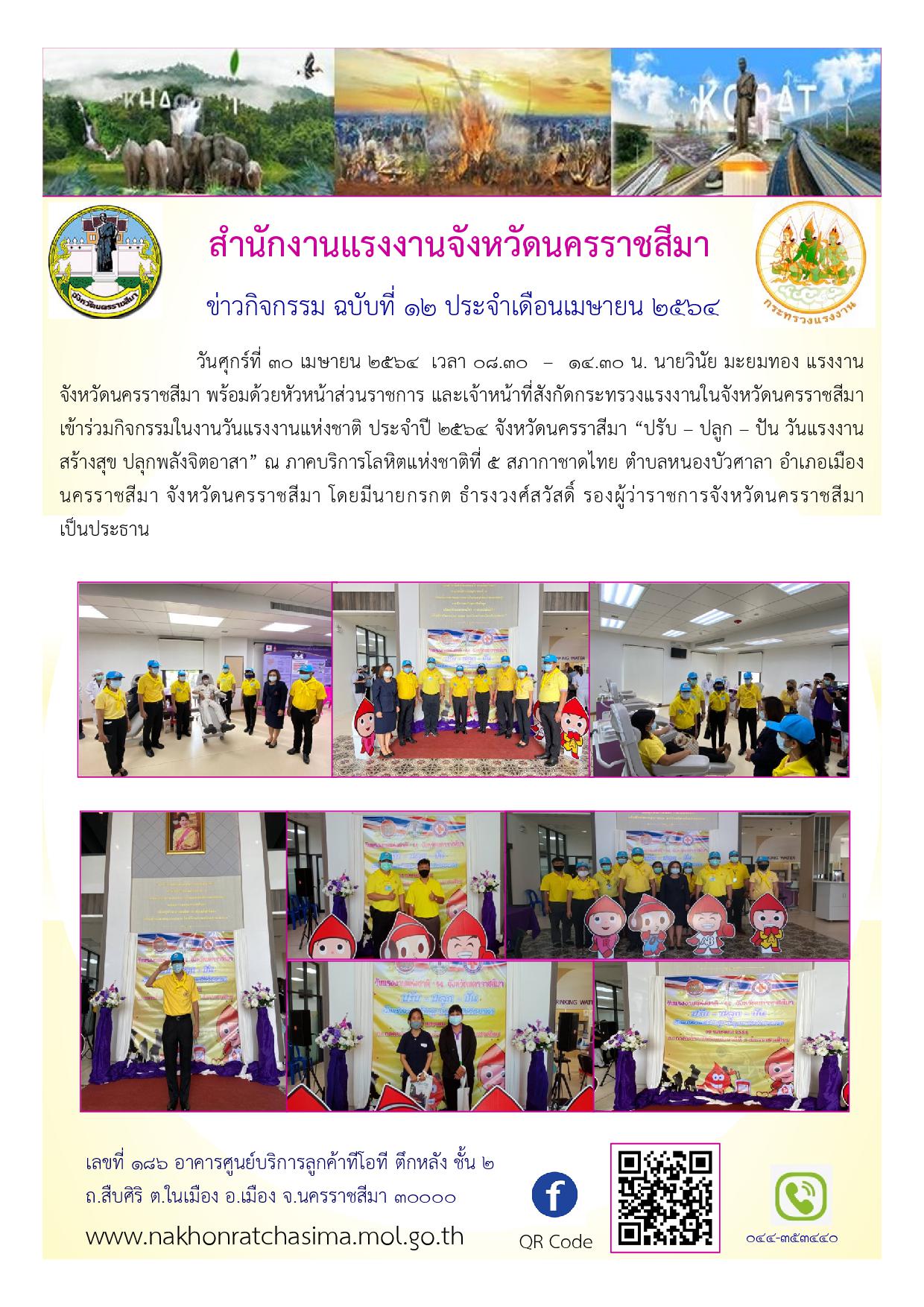 วันศุกร์ที่ 30 เมษายน 2564 เวลา 08.30 – 14.30 น. นายวินัย มะยมทอง แรงงานจังหวัดนครราชสีมา พร้อมด้วยหัวหน้าส่วนราชการ และเจ้าหน้าที่สังกัดกระทรวงแรงงานในจังหวัดนครราชสีมา เข้าร่วมกิจกรรมในงานวันแรงงานแห่งชาติ ประจำปี 2564 จังหวัดนครราสีมา “ปรับ – ปลูก – ปัน วันแรงงานสร้างสุข ปลุกพลังจิตอาสา” ณ ภาคบริการโลหิตแห่งชาติที่ 5 สภากาชาดไทย ตำบลหนองบัวศาลา อำเภอเมืองนครราชสีมา จังหวัดนครราชสีมา โดยมีนายกรกต ธำรงวงศ์สวัสดิ์ รองผู้ว่าราชการจังหวัดนครราชสีมา เป็นประธาน