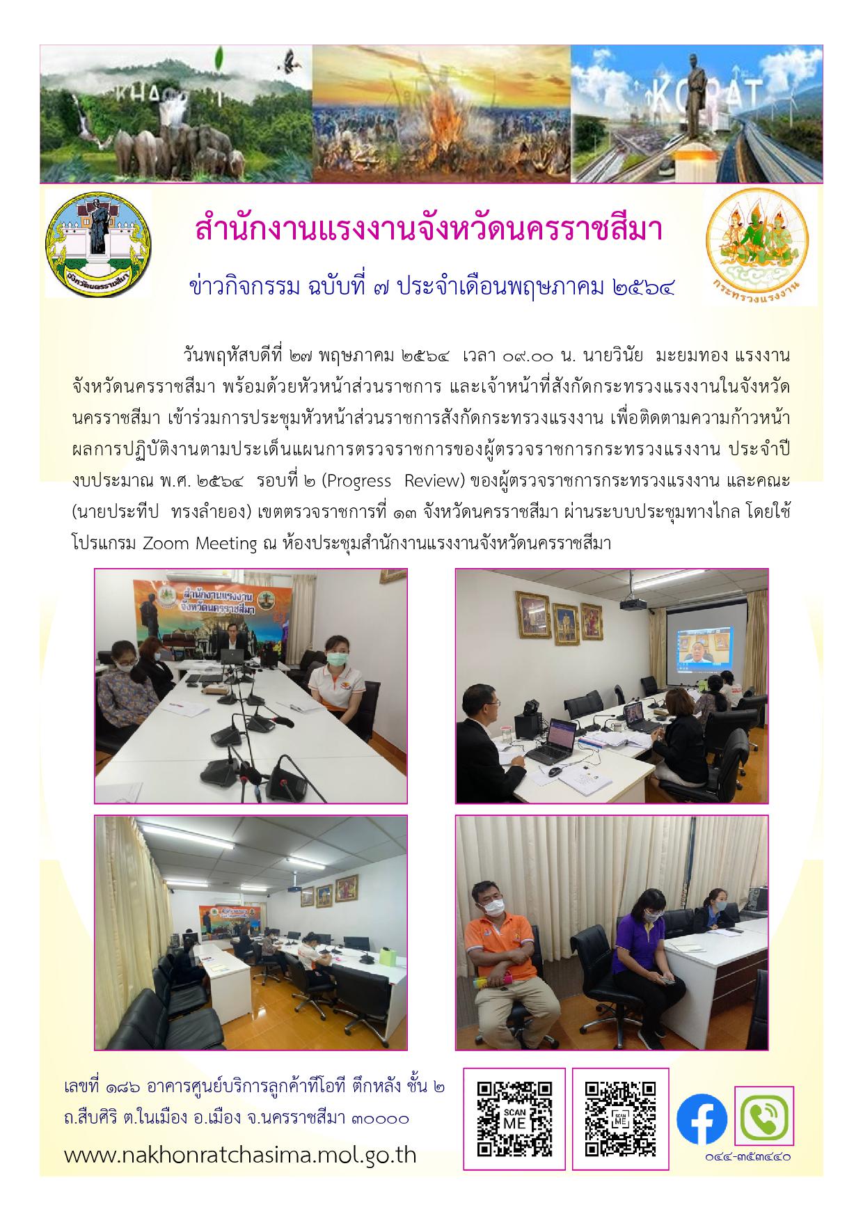 วันพฤหัสบดีที่ 27 พฤษภาคม 2564 เวลา 09.00 น. นายวินัย มะยมทอง แรงงานจังหวัดนครราชสีมา พร้อมด้วยหัวหน้าส่วนราชการ และเจ้าหน้าที่สังกัดกระทรวงแรงงานในจังหวัดนครราชสีมา เข้าร่วมการประชุมหัวหน้าส่วนราชการสังกัดกระทรวงแรงงาน เพื่อติดตามความก้าวหน้าผลการปฏิบัติงานตามประเด็นแผนการตรวจราชการของผู้ตรวจราชการกระทรวงแรงงาน ประจำปีงบประมาณ พ.ศ. 2564 รอบที่ 2 (Progress Review) ของผู้ตรวจราชการกระทรวงแรงงาน และคณะ (นายประทีป ทรงลำยอง) เขตตรวจราชการที่ 13 จังหวัดนครราชสีมา ผ่านระบบประชุมทางไกล โดยใช้โปรแกรม Zoom Meeting ณ ห้องประชุมสำนักงานแรงงานจังหวัดนครราชสีมา