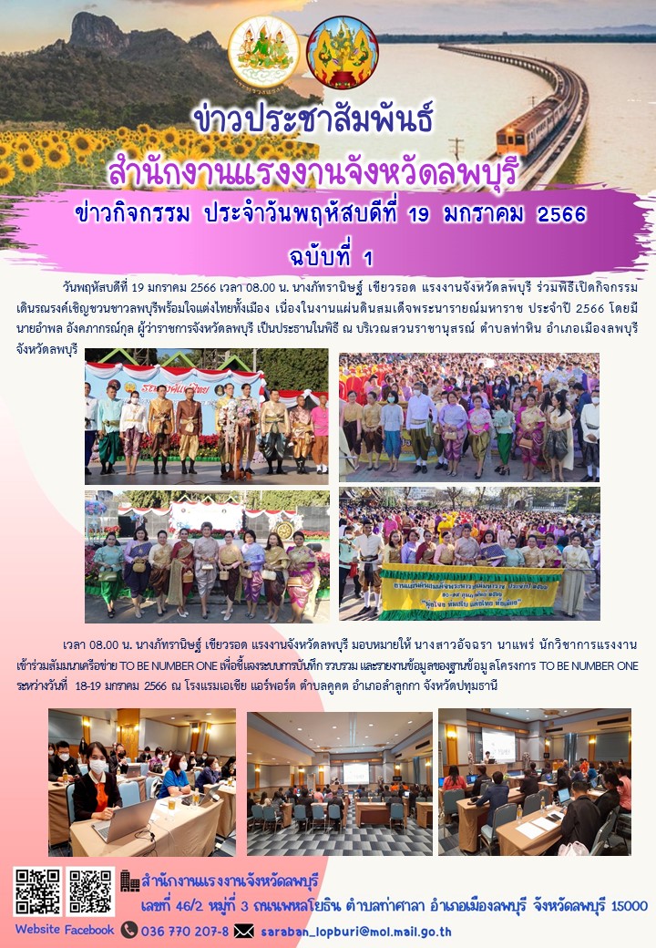 วันพฤหัสบดีที่ 19 มกราคม 2566 เวลา 08.00 น. นางภัทรานิษฐ์ เขียวรอด แรงงานจังหวัดลพบุรี ร่วมพิธีเปิดกิจกรรมเดินรณรงค์เชิญชวนชาวลพบุรีพร้อมใจแต่งไทยทั้งเมือง เนื่องในงานแผ่นดินสมเด็จพระนารายณ์มหาราช ประจำปี 2566 โดยมีนายอำพล อังคภากรณ์กุล ผู้ว่าราชการจังหวัดลพบุรี เป็นประธานในพิธี ณ บริเวณสวนราชานุสรณ์ ตำบลท่าหิน อำเภอเมืองลพบุรี จังหวัดลพบุรี
