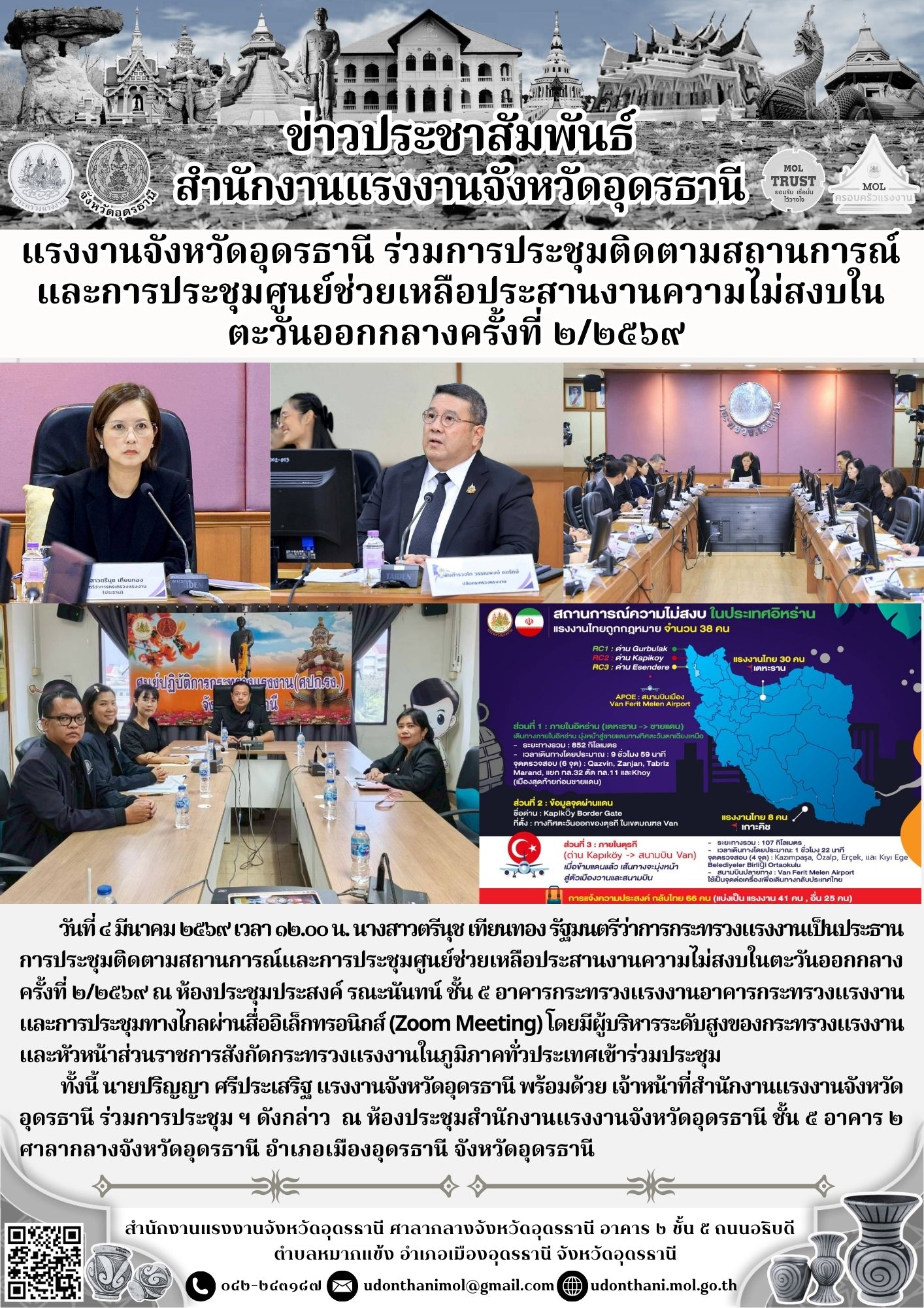 แรงงานจังหวัดอุดรธานี ร่วมการประชุมติดตามสถานการณ์และการประชุมศูนย์ช่วยเหลือประสานงานความไม่สงบในตะวันออกกลางครั้งที่ ๒/๒๕๖๙