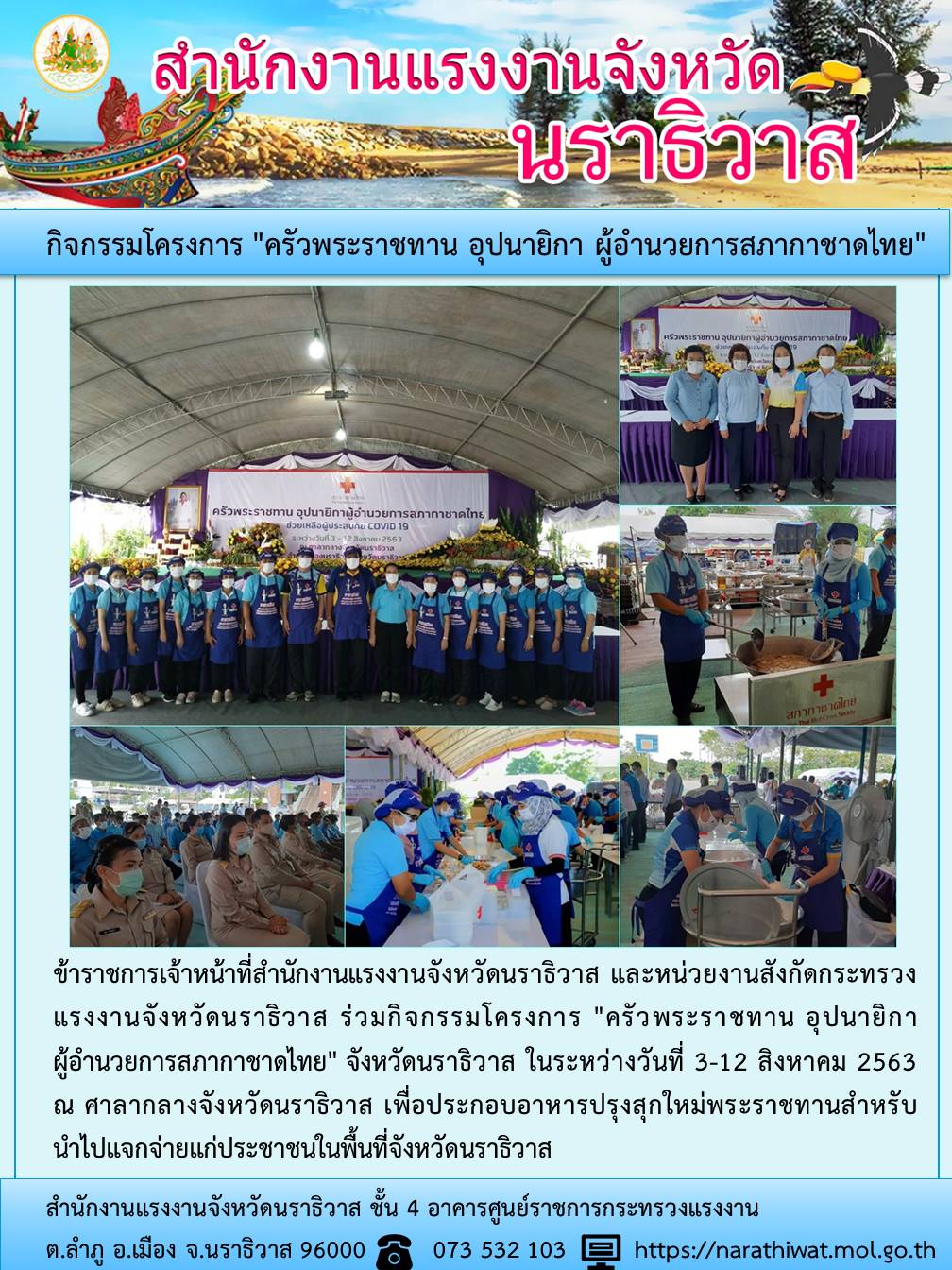 ข้าราชการเจ้าหน้าที่สำนักงานแรงงานจังหวัดนราธิวาส และหน่วยงานสังกัดกระทรวงแรงงานจังหวัดนราธิวาส ร่วมกิจกรรมโครงการ “ครัวพระราชทาน อุปนายิกาผู้อำนวยการสภากาชาดไทย” จังหวัดนราธิวาส