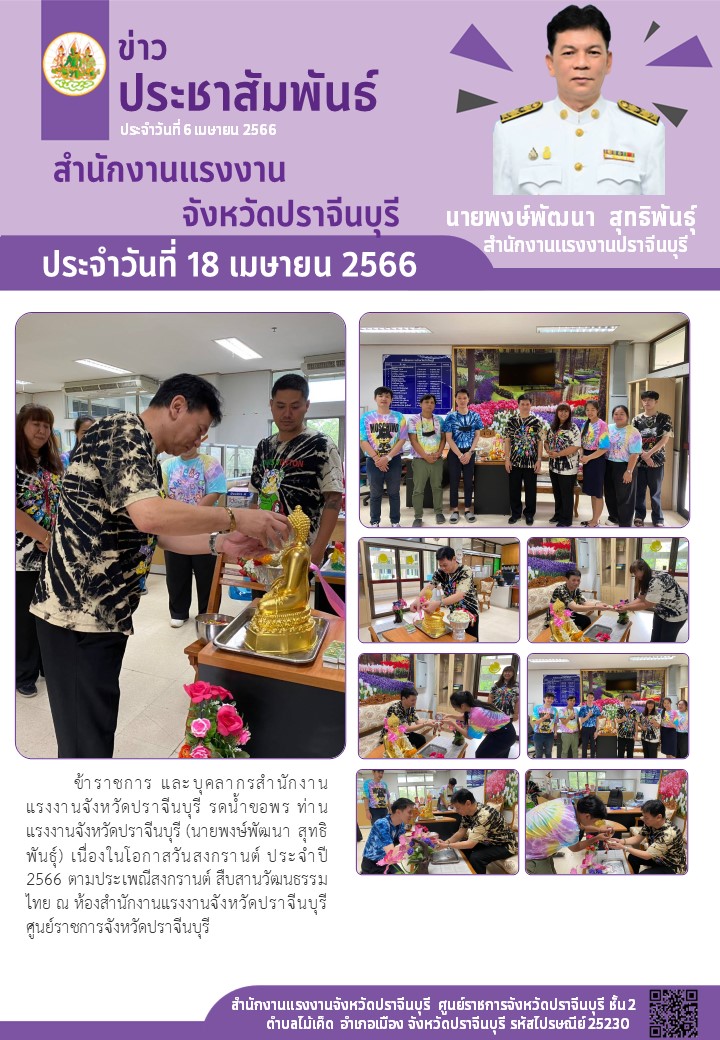 วันที่ 18 เมษายน 2566 ข้าราชการ และบุคลากรสำนักงานแรงงานจังหวัดปราจีนบุรี รดน้ำขอพร ท่านแรงงานจังหวัดปราจีนบุรี (นายพงษ์พัฒนา สุทธิพันธุ์) เนื่องในโอกาสวันสงกรานต์ ประจำปี 2566 ตามประเพณีสงกรานต์ สืบสานวัฒนธรรมไทย ณ ห้องสำนักงานแรงงานจังหวัดปราจีนบุรี ศูนย์ราชการจังหวัดปราจีนบุรี