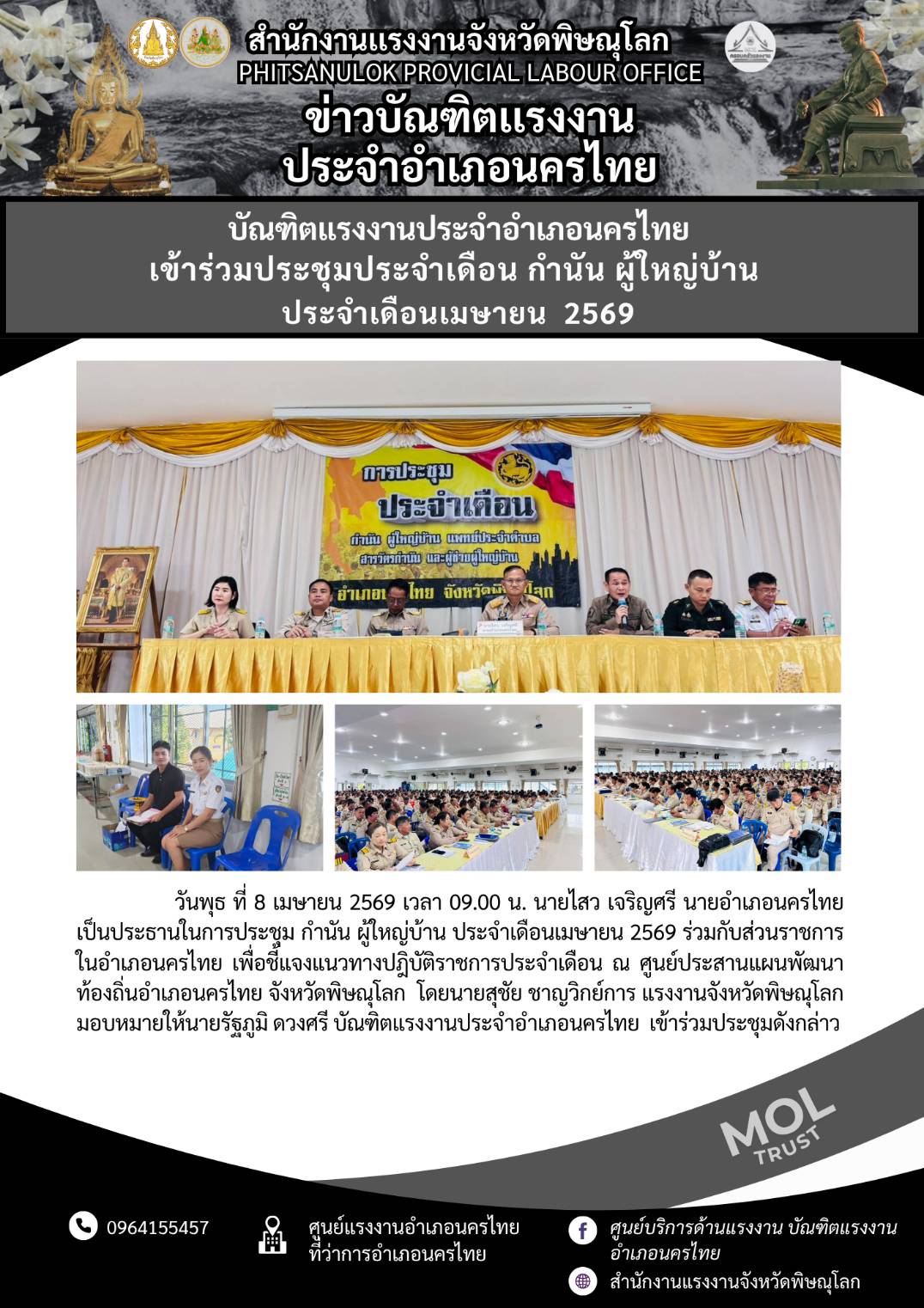 บัณฑิตแรงงานประจำอำเภอนครไทย เข้าร่วมประชุมประจำเดือน กำนัน ผู้ใหญ่บ้าน ประจำเดือนเมษายน 2569