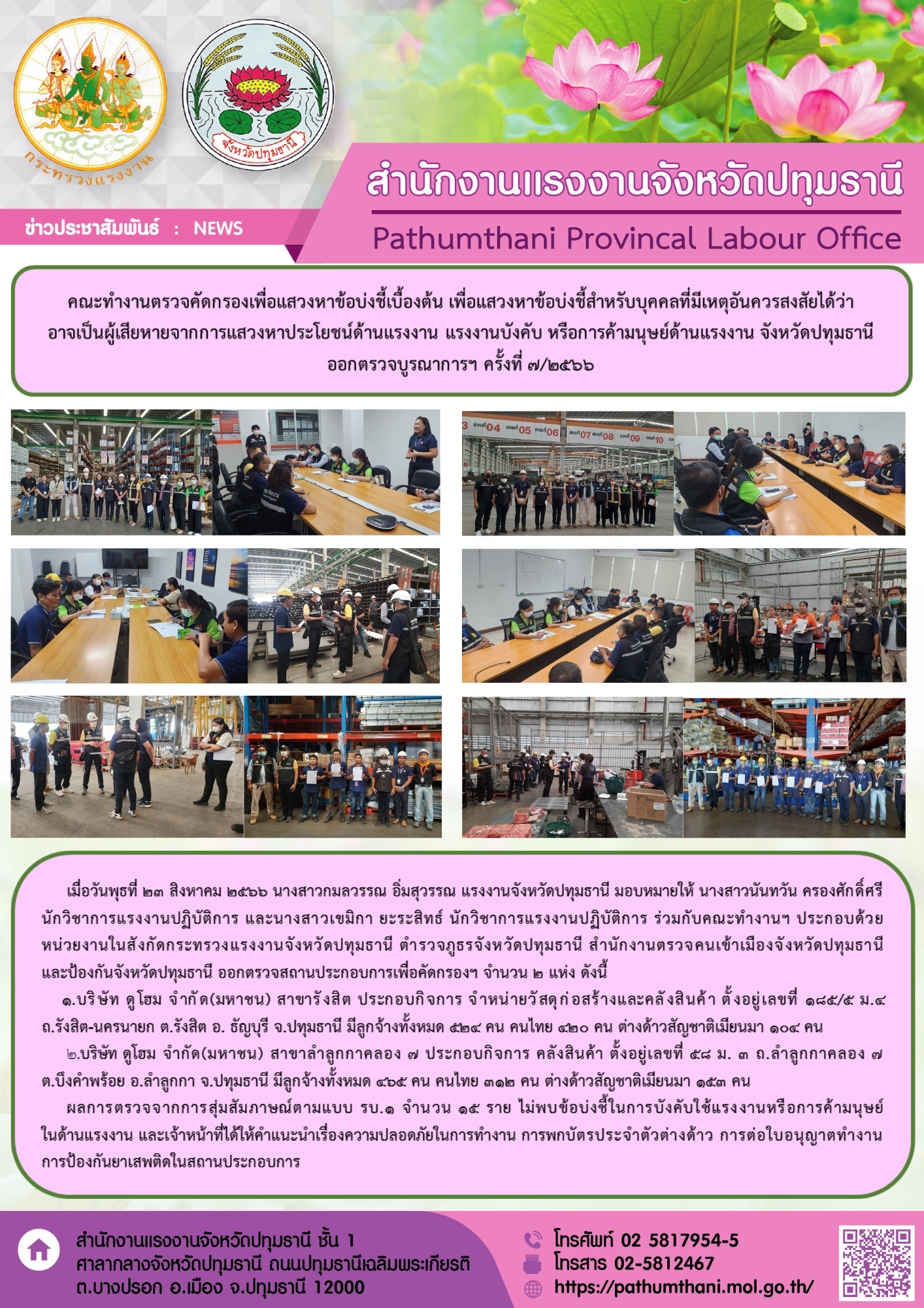 สรจ.ปทุมธานี ร่วมกับคณะทำงานตรวจคัดกรองเพื่อแสวงหาข้อบ่งชี้เบื้องต้น เพื่อแสวงหาข้อบ่งชี้สำหรับบุคคลที่มีเหตุอันควรสงสัยได้ว่าอาจเป็นผู้เสียหายจากการแสวงหาประโยชน์ด้านแรงงาน แรงงานบังคับ หรือการค้ามนุษย์ด้านแรงงาน จังหวัดปทุมธานี ออกตรวจบูรณาการฯ ครั้งที่ 7/2566