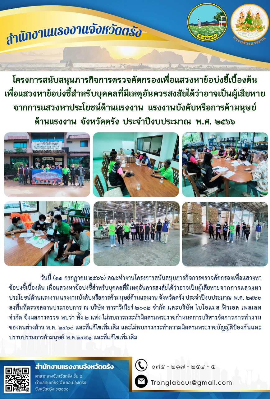 สรจ.ตรัง คณะทำงานโครงการสนับสนุนภารกิจการตรวจคัดกรองเพื่อแสวงหาข้อบ่งชี้เบื้องต้น เพื่อแสวงหาข้อบ่งชี้สำหรับบุคคลที่มีเหตุอันควรสงสัยได้ว่าอาจเป็นผู้เสียหายจากการแสวงหาประโยชน์ด้านแรงงาน แรงงานบังคับหรือการค้ามนุษย์ด้านแรงงาน จังหวัดตรัง ประจำปีงบประมาณ พ.ศ. 2566