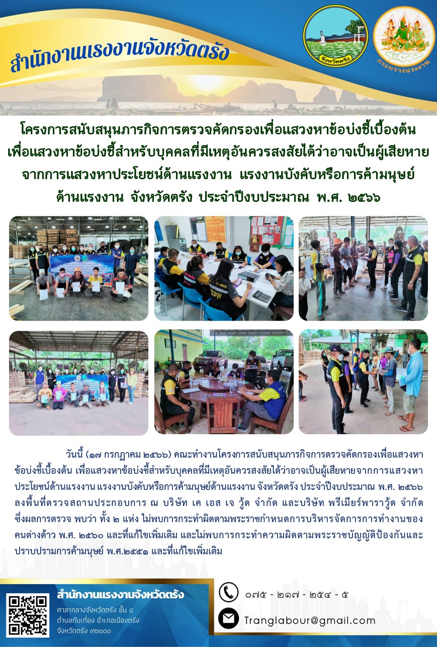 สรจ.ตรัง คณะทำงานโครงการสนับสนุนภารกิจการตรวจคัดกรองเพื่อแสวงหาข้อบ่งชี้เบื้องต้น เพื่อแสวงหาข้อบ่งชี้สำหรับบุคคลที่มีเหตุอันควรสงสัยได้ว่าอาจเป็นผู้เสียหายจากการแสวงหาประโยชน์ด้านแรงงาน แรงงานบังคับหรือการค้ามนุษย์ด้านแรงงาน จังหวัดตรัง ประจำปีงบประมาณ พ.ศ. 2566 ลงพื้นที่ตรวจสถานประกอบการ ณ บริษัท เค เอส เจ วู้ด จำกัด และบริษัท พรีเมียร์พาราวู้ด จำกัด