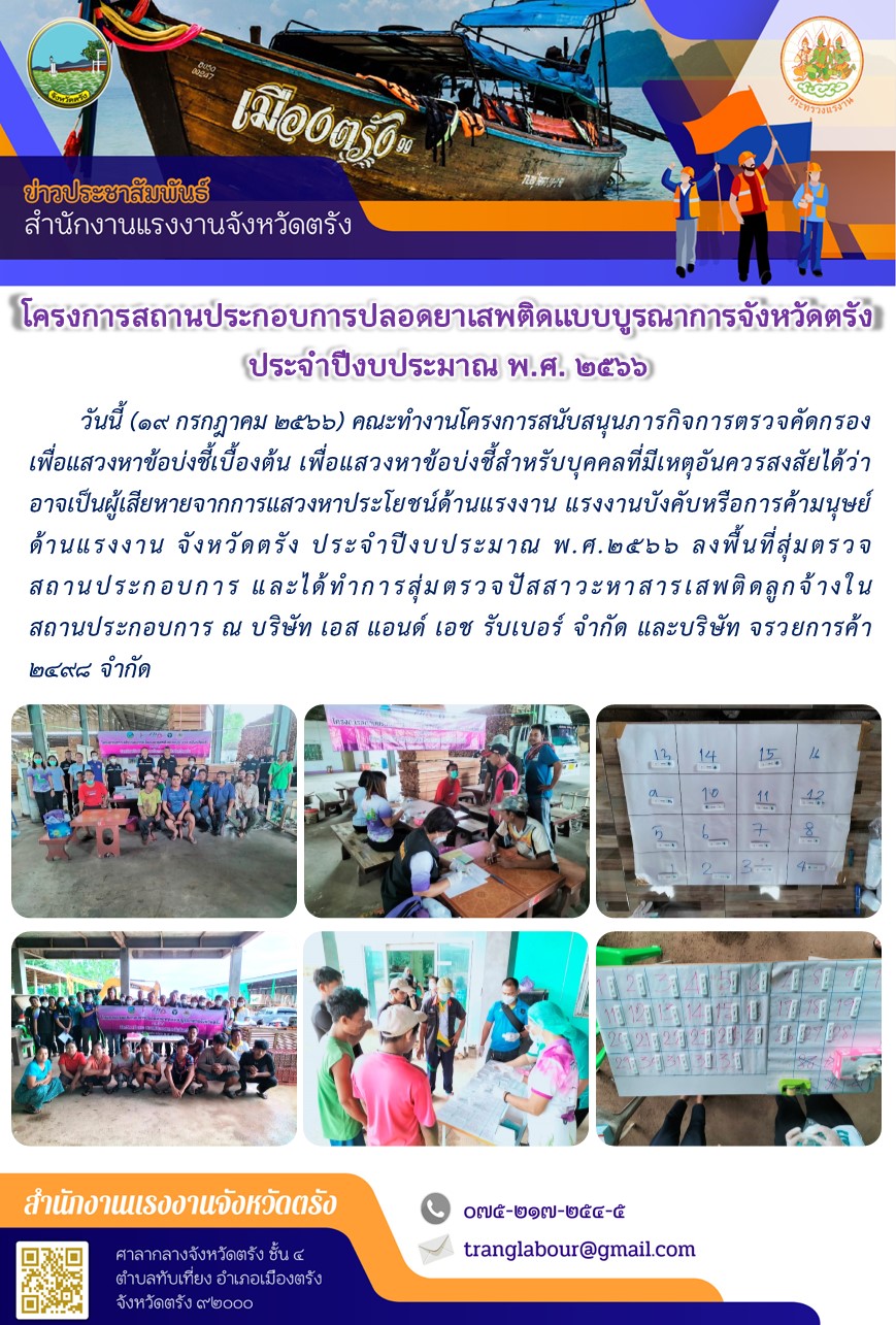 สรจ.ตรัง คณะทำงานโครงการสนับสนุนภารกิจการตรวจคัดกรองเพื่อแสวงหาข้อบ่งชี้เบื้องต้น เพื่อแสวงหาข้อบ่งชี้สำหรับบุคคลที่มีเหตุอันควรสงสัยได้ว่าอาจเป็นผู้เสียหายจากการแสวงหาประโยชน์ด้านแรงงาน แรงงานบังคับหรือการค้ามนุษย์ด้านแรงงาน จังหวัดตรัง ประจำปีงบประมาณ พ.ศ.2566 ลงพื้นที่สุ่มตรวจปัสสาวะหาสารเสพติดลูกจ้างในสถานประกอบการ ณ บริษัท เอส แอนด์ เอช รับเบอร์ จำกัด และบริษัท จรวยการค้า 2498 จำกัด