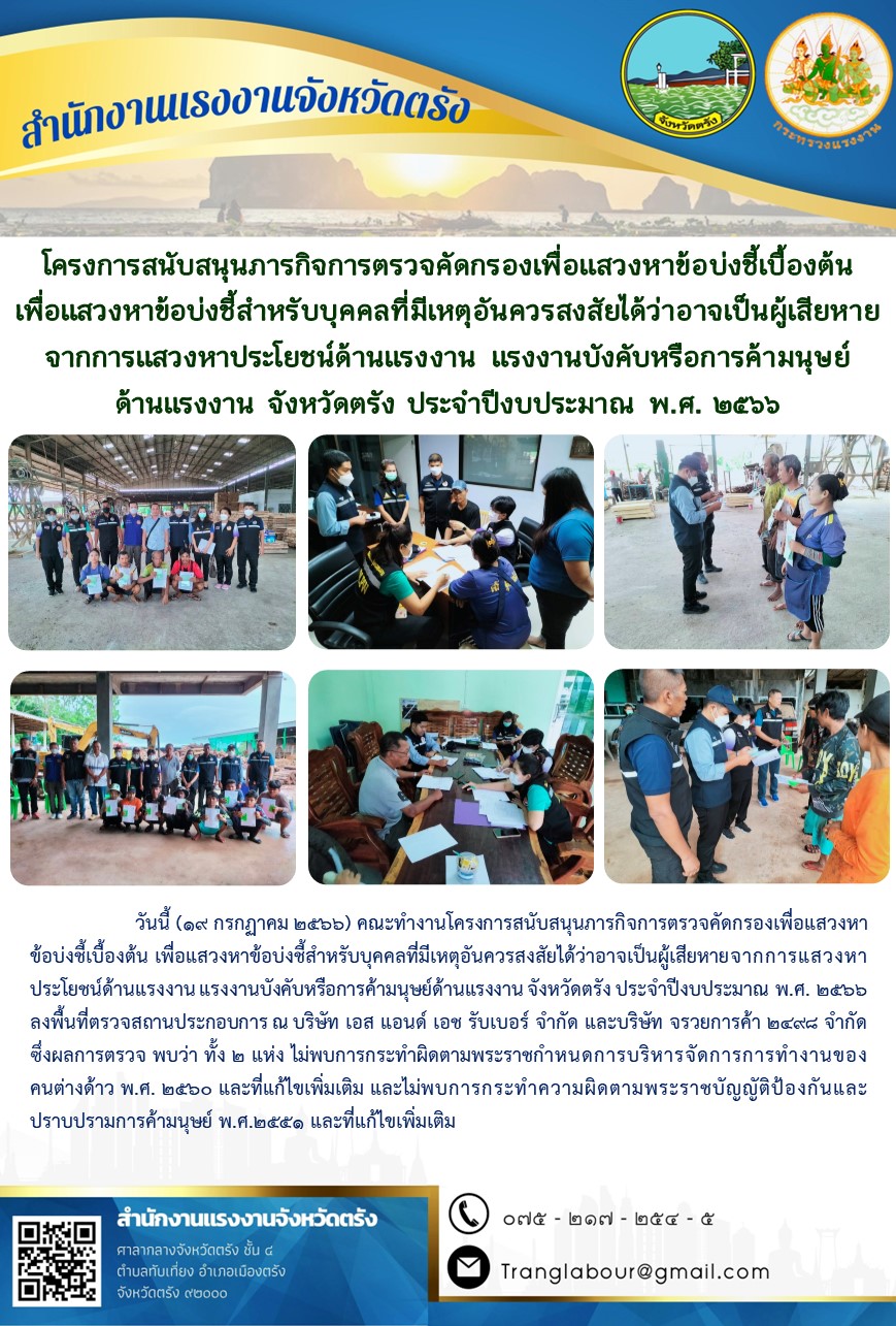 สรจ.ตรัง สนับสนุนภารกิจการตรวจคัดกรองเพื่อแสวงหาข้อบ่งชี้เบื้องต้น เพื่อแสวงหาข้อบ่งชี้สำหรับบุคคลที่มีเหตุอันควรสงสัยได้ว่าอาจเป็นผู้เสียหายจากการแสวงหาประโยชน์ด้านแรงงาน แรงงานบังคับหรือการค้ามนุษย์ด้านแรงงาน จังหวัดตรัง ประจำปีงบประมาณ พ.ศ. 2566