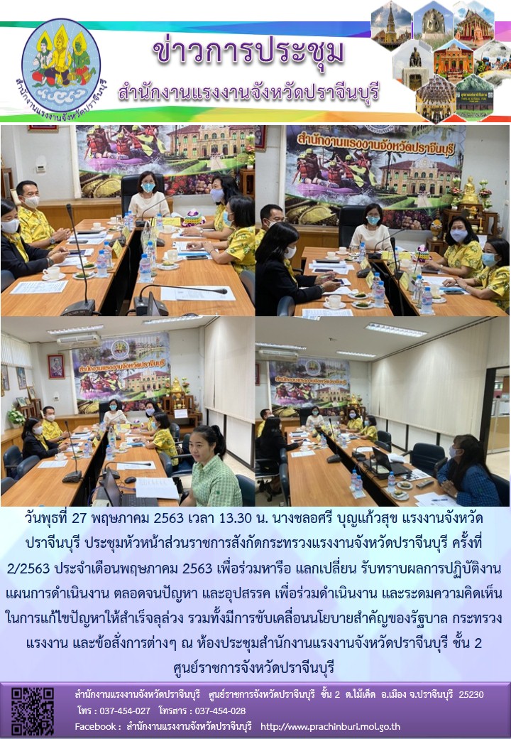 วันพุธที่ 27 พฤษภาคม 2563 เวลา 10.00 น. นายพิบูลย์ หัตถกิจโกศล ผู้ว่าราชการจังหวัดปราจีนบุรี เป็นประธานการประชุมคณะอนุกรรมการประกันสังคมจังหวัดปราจีนบุรี ครั้งที่ 2/2563 เพื่อรับทราบสถานการณ์ด้านประกันสังคมในจังหวัด และเพื่อพิจารณากรณีผู้ประกันตนขอรับสิทธิประโยชน์ จำนวน 3 ราย โดยมีนางชลอศรี บุญแก้วสุข แรงงานจังหวัดปราจีนบุรี และคณะอนุกรรมการฯ เข้าร่วมประชุม ณ ห้องประชุม 201 (พานหิน) ชั้น 2 ศูนย์ราชการจังหวัดปราจีนบุรี