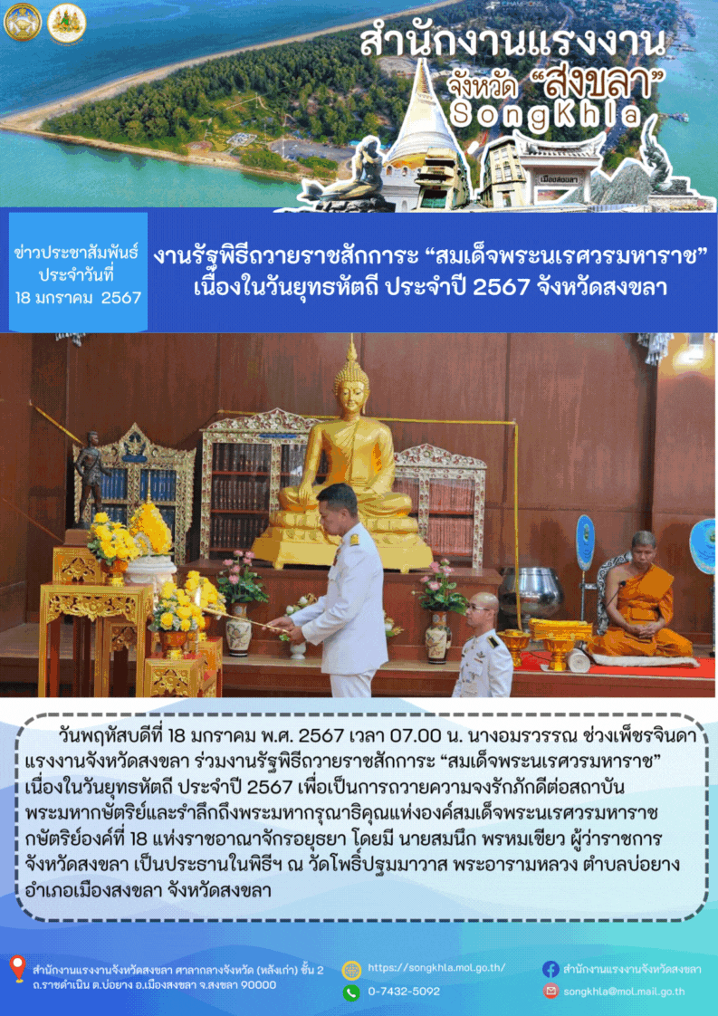 วันพฤหัสบดีที่ 18 มกราคม พ.ศ. 2567 เวลา 07.00 น. นางอมรวรรณ ช่วงเพ็ชรจินดา แรงงานจังหวัดสงขลา ร่วมงานรัฐพิธีถวายราชสักการะ “สมเด็จพระนเรศวรมหาราช” เนื่องในวันยุทธหัตถี ประจำปี 2567 เพื่อเป็นการถวายความจงรักภักดีต่อสถาบันพระมหากษัตริย์และรำลึกถึงพระมหากรุณาธิคุณแห่งองค์สมเด็จพระนเรศวรมหาราช กษัตริย์องค์ที่ 18 แห่งราชอาณาจักรอยุธยา โดยมี นายสมนึก พรหมเขียว ผู้ว่าราชการจังหวัดสงขลา เป็นประธานในพิธีฯ ณ วัดโพธิ์ปฐมมาวาส พระอารามหลวง ตำบลบ่อยาง อำเภอเมืองสงขลา จังหวัดสงขลา