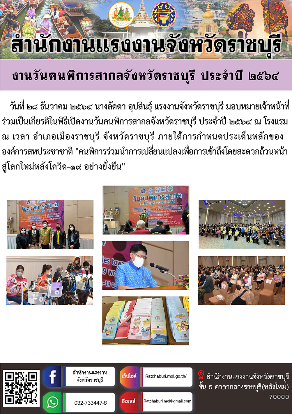 เปิดงานวันคนพิการสากลจังหวัดราชบุรี ประจำปี ๒๕๖๔ ณ โรงแรม ณ เวลา อำเภอเมืองราชบุรี จังหวัดราชบุรี ภายใต้การกำหนดประเด็นหลักขององค์การสหประชาชาติ “คนพิการร่วมนำการเปลี่ยนแปลงเพื่อการเข้าถึงโดยสะดวกถ้วนหน้าสู่โลกใหม่