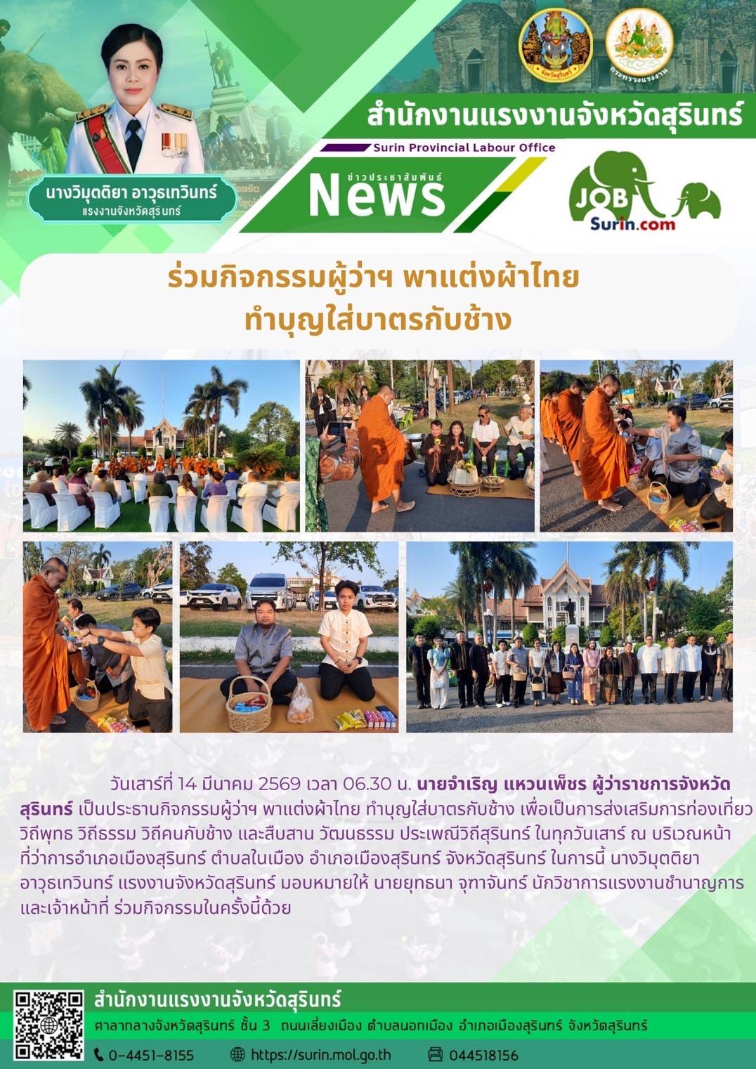 แรงงานจังหวัดสุรินทร์ ร่วมกิจกรรมผู้ว่าฯ พาแต่งผ้าไทย ทำบุญใส่บาตรกับช้าง
