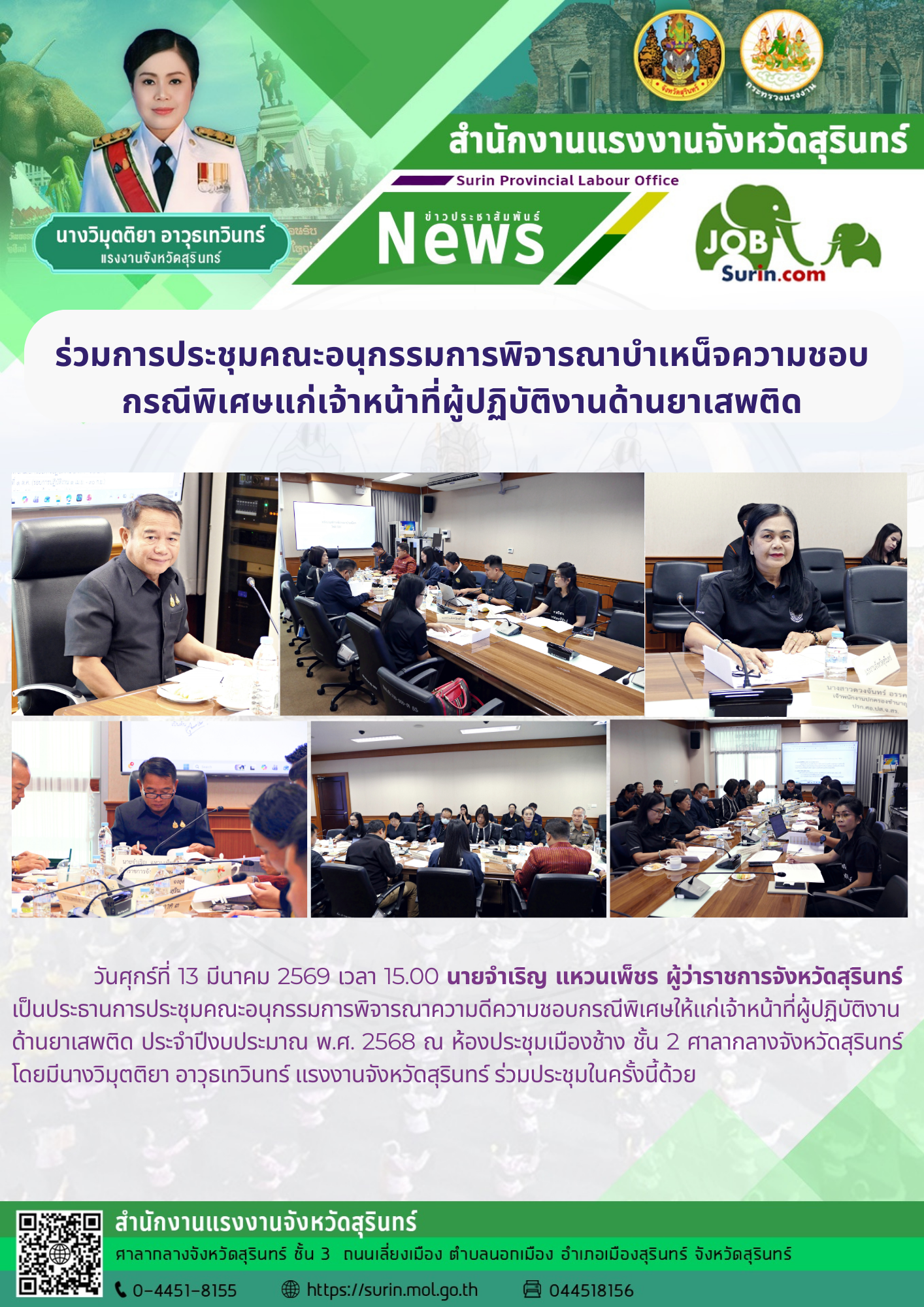 แรงงานจังหวัดสุรินทร์ ร่วมการประชุมคณะอนุกรรมการพิจารณาบำเหน็จความชอบ กรณีพิเศษแก่เจ้าหน้าที่ผู้ปฏิบัติงานด้านยาเสพติด
