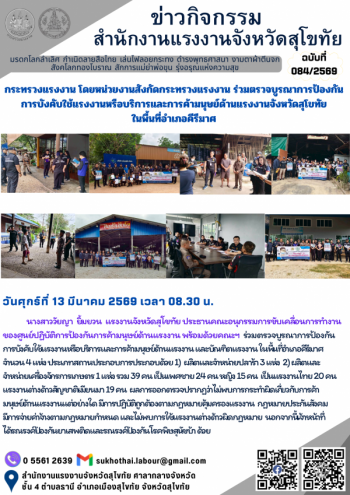 กระทรวงแรงงาน โดยหน่วยงานสังกัดกระทรวงแรงงาน ร่วมตรวจบูรณาการป้องกันการบังคับใช้แรงงานหรือบริการและการค้ามนุษย์ด้านแรงงานจังหวัดสุโขทัยในพื้นที่อำเภอคีรีมาศ