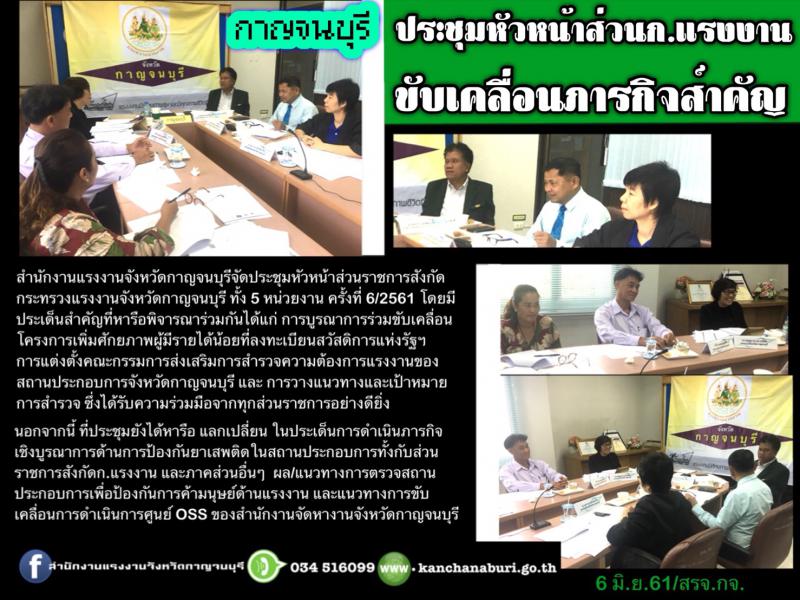 สำนักงานแรงงานจังหวัดกาญจนบุรี จัดประชุมหัวหน้าส่วนราชการสังกัดกระทรวงแรงงานจังหวัดกาญจนบุรี ทั้ง 5 หน่วยงาน ครั้งที่ 6/2561 โดยมีประเด็นสำคัญที่หารือพิจารณาร่วมกันได้แก่ การบูรณาการร่วมขับเคลื่อนโครงการเพิ่มศักยภาพผู้มีรายได้น้อยที่ลงทะเบียนสวัสดิการแห่งรัฐฯ การแต่งตั้งคณะกรรมการส่งเสริมการสำรวจความต้องการความต้องการแรงงานของสถานประกอบการจังหวัดกาญจนบุรีและการวางแนวทางและเป้าหมายการสำรวจ ซึ่งได้รับความร่วมมือจากทุกภาคส่วนราชการอย่างดียิ่งนอกจากนี้ที่ประชุมยังได้หารือ แลกเปลี่ยนในประเด็นการดำเนินภารกิจเชิงบูรณาการด้านการป้องกันยาเสพติดในสถานประกอบการทั้งกับส่วนราชการสังกัดกระทรวงแรงงาน และภาคส่วนอื่นๆ ผล/แนวทางการขับเคลื่อนการดำเนินการศูนย์ OSS ของสำนักงานจัดหางานจังหวัดกาญจนบุรี