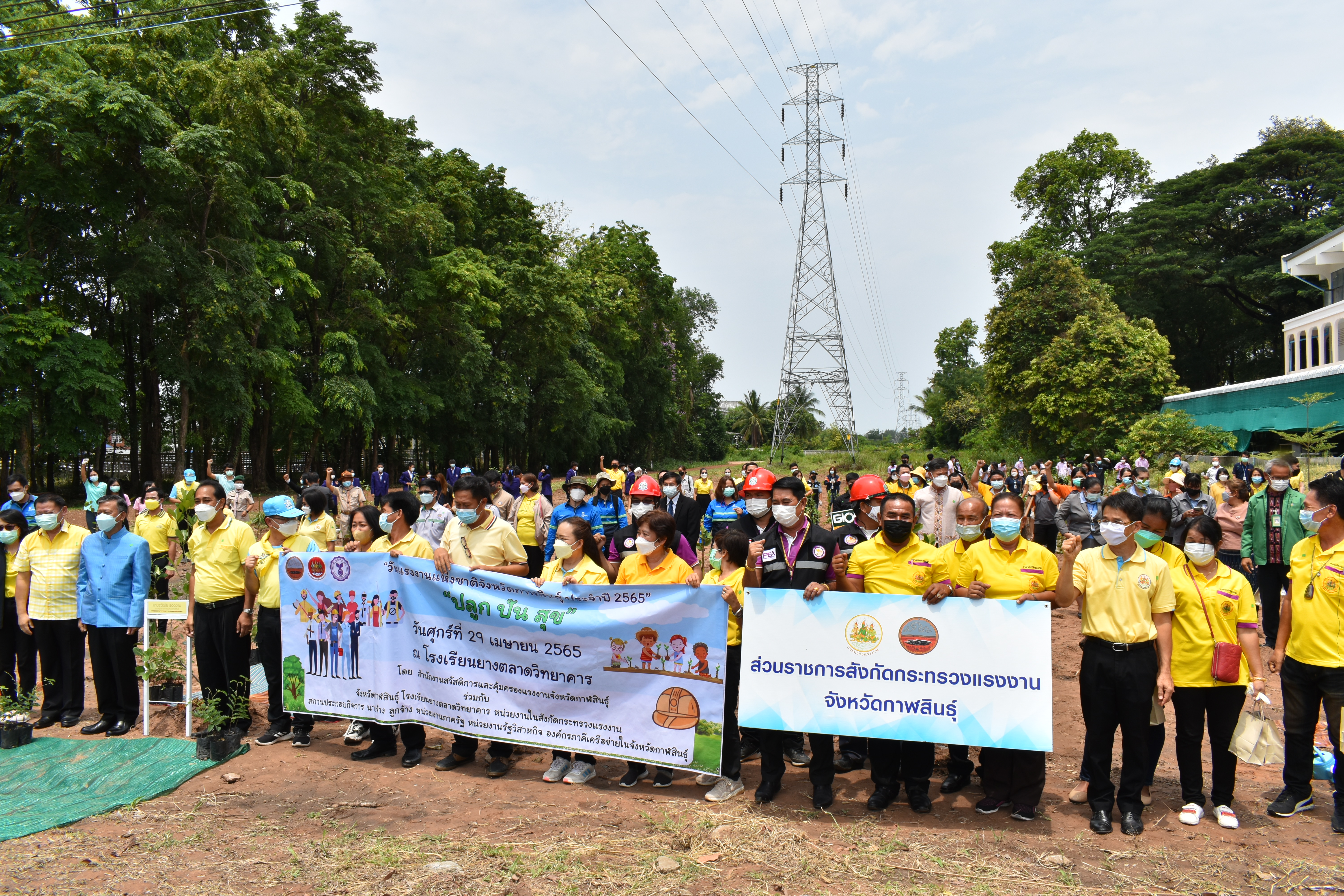 วันศุกร์ที่ 29 เมษายน พ.ศ. 2565 เวลา 10.00 น. จังหวัดกาฬสินธุ์ โดยสำนักงานสวัสดิการและคุ้มครองแรงงานจังหวัดกาฬสินธุ์ พร้อมด้วยส่วนราชการสังกัดกระทรวงแรงงานจังหวัดกาฬสินธุ์ หน่วยงานภาครัฐ/รัฐวิสาหกิจ/ภาคเอกชน อาสาสมัครแรงงานระดับตำบลจังหวัดกาฬสินธุ์ นายจ้าง/ลูกจ้างสถานประกอบการ บุคลากรทางการศึกษาและนักเรียนโรงเรียนยางตลาดวิทยาคาร ร่วมกิจกรรม วันแรงงานแห่งชาติ ปี 2565 “ปลูก ปัน สุข” โดยมีนายธวัชชัย รอดงาม รองผู้ว่าราชการจังหวัดกาฬสินธุ์ ให้เกียรติเป็นประธานในพิธีเปิด พร้อมทั้งร่วมปลูกตันไม้ ณ โรงเรียนยางตลาดวิทยาคาร ตำบลยางตลาด อำเภอยางตลาด จังหวัดกาฬสินธุ์ ภายใต้มาตรการควบคุมโรคโควิด -19 อย่างเคร่งครัด