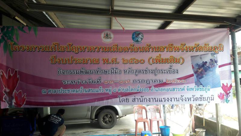 เมื่อวันที่ 13 กรกฎาคม 2560 นายภูสิต ตราชูวณิช แรงงานจังหวัดชัยภูมิ และเจ้าหน้าที่ ชี้แจงรายละเอียดโครงการและเปิดการฝึกอาชีพ ช่างปูกระเบื้อง ตามโครงการแก้ไขปัญหาความเดือดร้อนด้านอาชีพจังหวัดชัยภูมิ ณ ศาลาประชาคมบ้านสระแก้ว ม.8 ต.โคกมั่งงอย อ.คอนสวรรค์