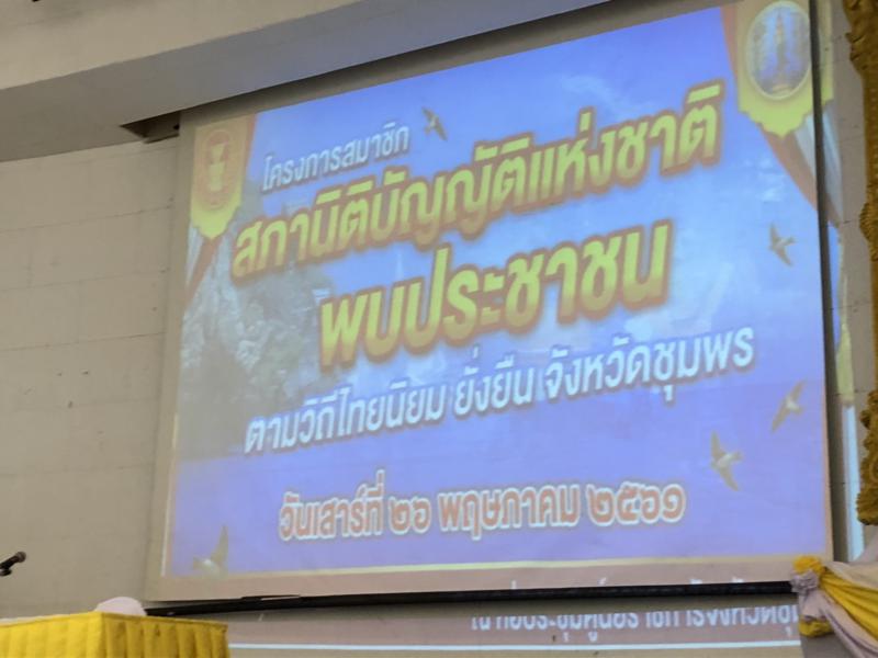 วันที่ 26 พ.ค.2561 เวลา 09.30 น.จังหวัดชุมพร จัดโครงการสมาชิกสภานิติบัญญัติแห่งชาติพบประชาชน โดย พลตรี กลชัย สุวรรณบูรณ์ และ พล ต.ท.ศานิตย์ มหถาวร สมาชิกสภานิติบัญญัติแห่งชาติ พบปะ รับฟังความคิดเห็นและให้คำแนะนำประชาชน ณ.หอประชุมศูนย์ราชการจังหวัดชุมพร มีผู้เข้าร่วมจำนวน 400 คน จาก 8 อำเภอ ทั้งนี้ นาย วิระ ทองพิจิตร ปลัดจังหวัดชุมพร กล่าวต้อนรับและรายงานผลการดำเนินการโครงการ ไทยนิยม ยั่งยืน ในการนี้นางสาวกานต์กมล ชุมภูทอง แรงงานจังหวัดชุมพร ร่วมในกิจกรรมฯ