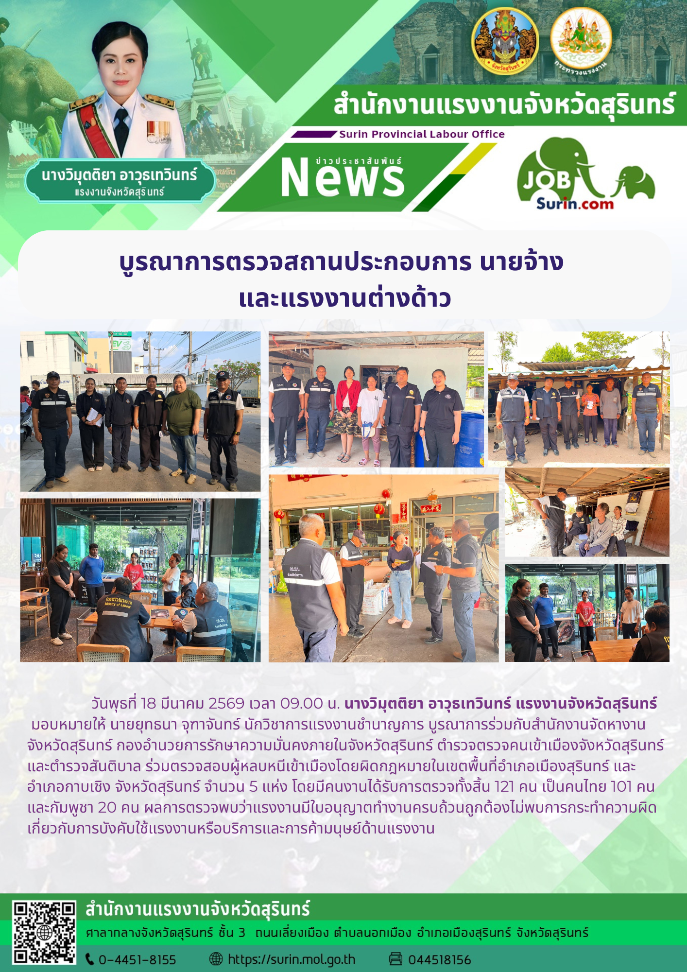 แรงงานจังหวัดสุรินทร์ บูรณาการตรวจสถานประกอบการ นายจ้าง และแรงงานต่างด้าว