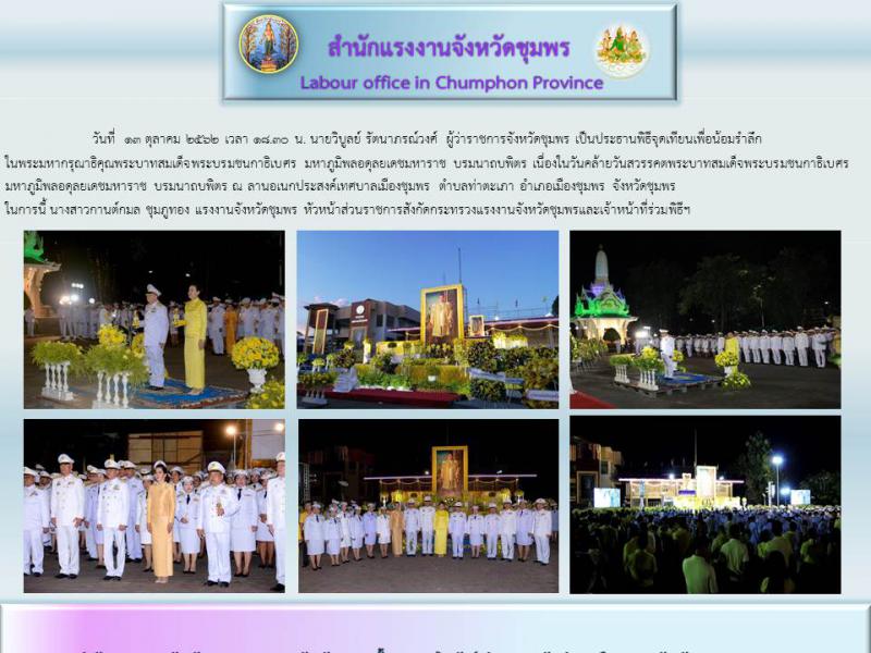 จังหวัดชุมพร จัดพิธีจุดเทียนเพื่อน้อมรำลึกในพระมหากรุณาธิคุณพระบาทสมเด็จพระบรมชนกาธิเบศร มหาภูมิพลอดุลยเดชมหาราช บรมนาถบพิตร เนื่องในวันคล้ายวันสวรรคตพระบาทสมเด็จพระบรมชนกาธิเบศร มหาภูมิพลอดุลยเดชมหาราช บรมนาถบพิตร