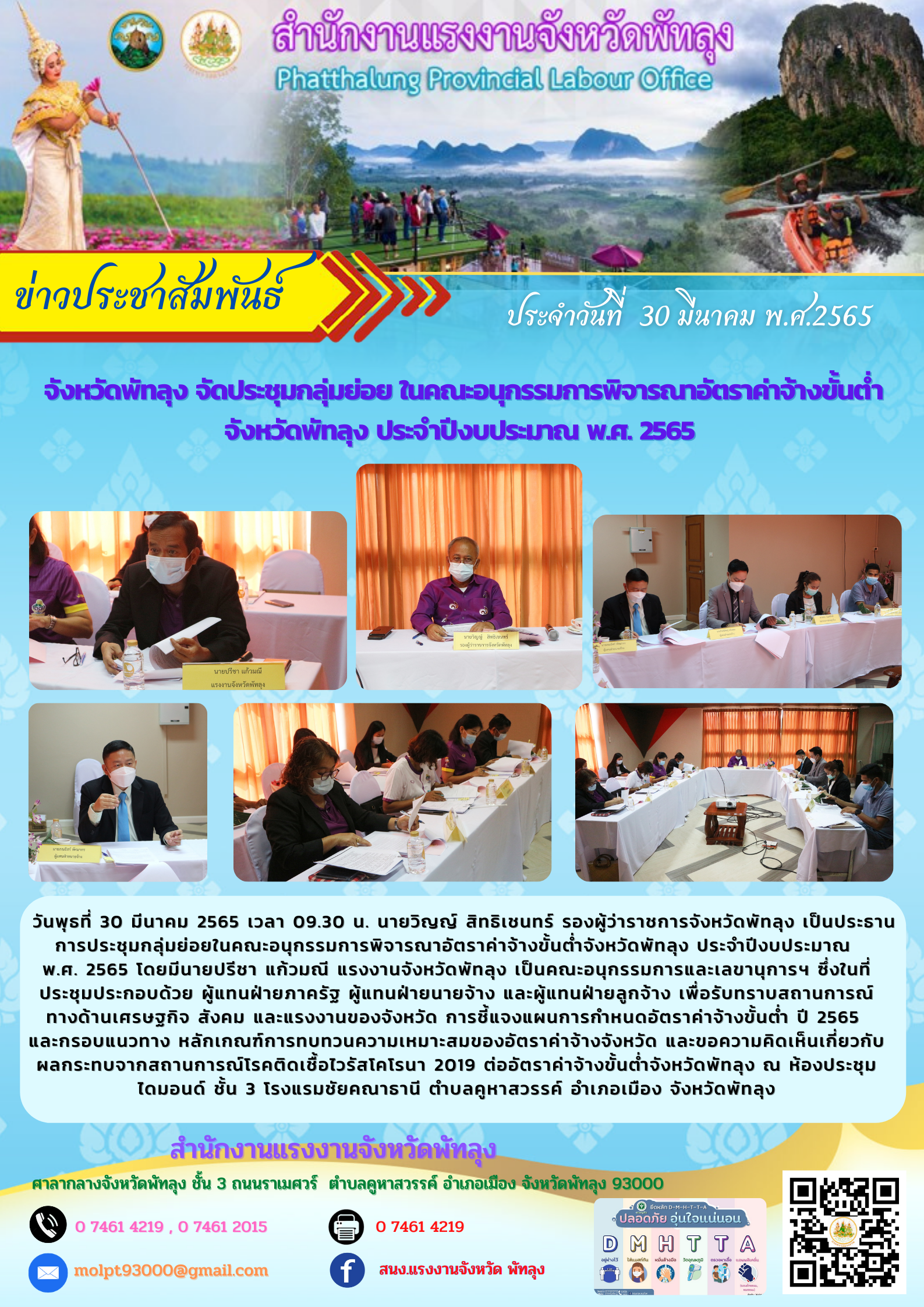 วันพุธที่ 30 มีนาคม 2565 เวลา 09.30 น. นายวิญญ์ สิทธิเชนทร์ รองผู้ว่าราชการจังหวัดพัทลุง เป็นประธานการประชุมกลุ่มย่อย ในคณะอนุกรรมการพิจารณาอัตราค่าจ้างขั้นต่ำจังหวัดพัทลุง ประจำปีงบประมาณ พ.ศ.2565 โดยมีนายปรีชา แก้วมณี แรงงานจังหวัดพัทลุง เป็นคณะอนุกรรมการและเลขานุการฯ ซึ่งในที่ประชุมประกอบด้วย ผู้แทนฝ่ายภาครัฐ ผู้แทนฝ่ายนายจ้าง และผู้แทนฝ่ายลูกจ้าง เพื่อรับทราบสถานการณNทางด้านเศรษฐกิจ สังคม และแรงงานของจังหวัด การชี้แจงแผนการกำหนดอัตราค่าจ้างขั้นต่ำ ปี 2565 และกรอบแนวทาง หลักเกณฑ์การทบทวนความเหมาะสมของอัตราค่าจ้างจังหวัด และขอความคิดเห็นเกี่ยวกับผลกระทบจากสถานการณ์โรคติดเชื้อไวรัสโคโรนา 2019 ต่ออัตราค่าจ้างขั้นต่ำจังหวัดพัทลุง ณ ห้องประชุมไดมอนด์ ชั้น 3 โรงแรมชัยคณาธานี ตำบลคูหาสวรรค์ อำเภอเมือง จังหวัดพัทลุง