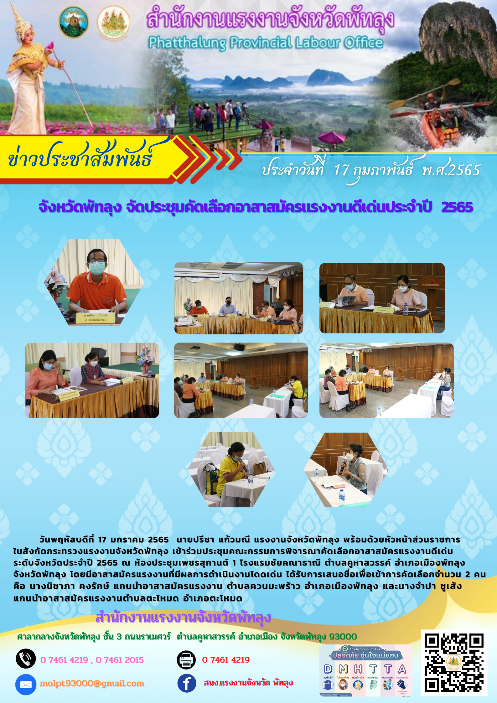 วันพฤหัสบดีที่ 17 มกราคม 2565 นายปรีชา แก้วมณี แรงงานจังหวัดพัทลุง พร้อมด้วยหัวหน้าส่วนราชการในสังกัดกระทรวงแรงงานจังหวัดพัทลุง เข้าร่วมประชุมคณะกรรมการพิจารณาคัดเลือกอาสาสมัครแรงงานดีเด่นระดับจังหวัดประจำปี 2565 ณ ห้องประชุมเพชรสุกานต์ 1 โรงแรมชัยคณาธาณี ตำบลคูหาสวรรค์ อำเภอเมืองพัทลุงจังหวัดพัทลุง โดยมีอาสาสมัครแรงงานที่มีผลการดำเนินงานโดดเด่น ได้รับการเสนอชื่อเพื่อเข้าการคัดเลือกจำนวน 2 คนคือ นางนิชาภา คงรักษ์ แกนนำอาสาสมัครแรงงาน ตำบลควนมะพร้าว อำเภอเมืองพัทลุง และนางจำปา ชูเส้งแกนนำอาสาสมัครแรงงานตำบลตะโหมด อำเภอตะโหมด