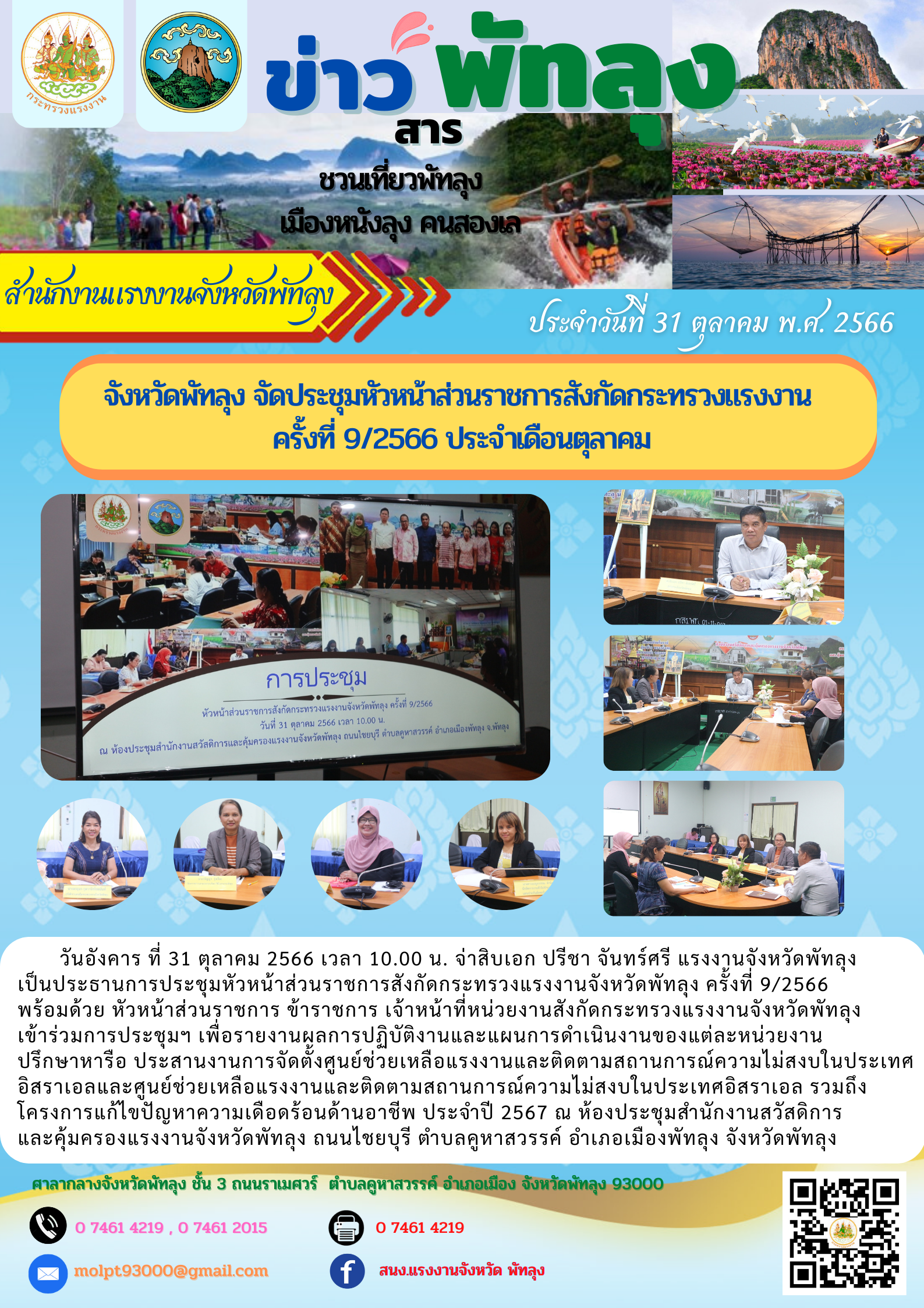 วันอังคาร ที่ 31 ตุลาคม 2566 เวลา 10.00 น. จ่าสิบเอก ปรีชา จันทร์ศรี แรงงานจังหวัดพัทลุง เป็นประธานการประชุมหัวหน้าส่วนราชการสังกัดกระทรวงแรงงานจังหวัดพัทลุง ครั้งที่ 9/2566 พร้อมด้วย หัวหน้าส่วนราชการ ข้าราชการ เจ้าหน้าที่หน่วยงานสังกัดกระทรวงแรงงานจังหวัดพัทลุง เข้าร่วมการประชุมฯ เพื่อรายงานผลการปฏิบัติงานและแผนการดำเนินงานของแต่ละหน่วยงาน ปรึกษาหารือ ประสานงานการจัดตั้งศูนย์ช่วยเหลือแรงงานและติดตามสถานการณ์ความไม่สงบในประเทศอิสราเอลและศูนย์ช่วยเหลือแรงงานและติดตามสถานการณ์ความไม่สงบในประเทศอิสราเอล รวมถึงโครงการแก้ไขปัญหาความเดือดร้อนด้านอาชีพ ประจำปี 2567 ณ ห้องประชุมสำนักงานสวัสดิการ และคุ้มครองแรงงานจังหวัดพัทลุง ถนนไชยบุรี ตำบลคูหาสวรรค์ อำเภอเมืองพัทลุง จังหวัดพัทลุง