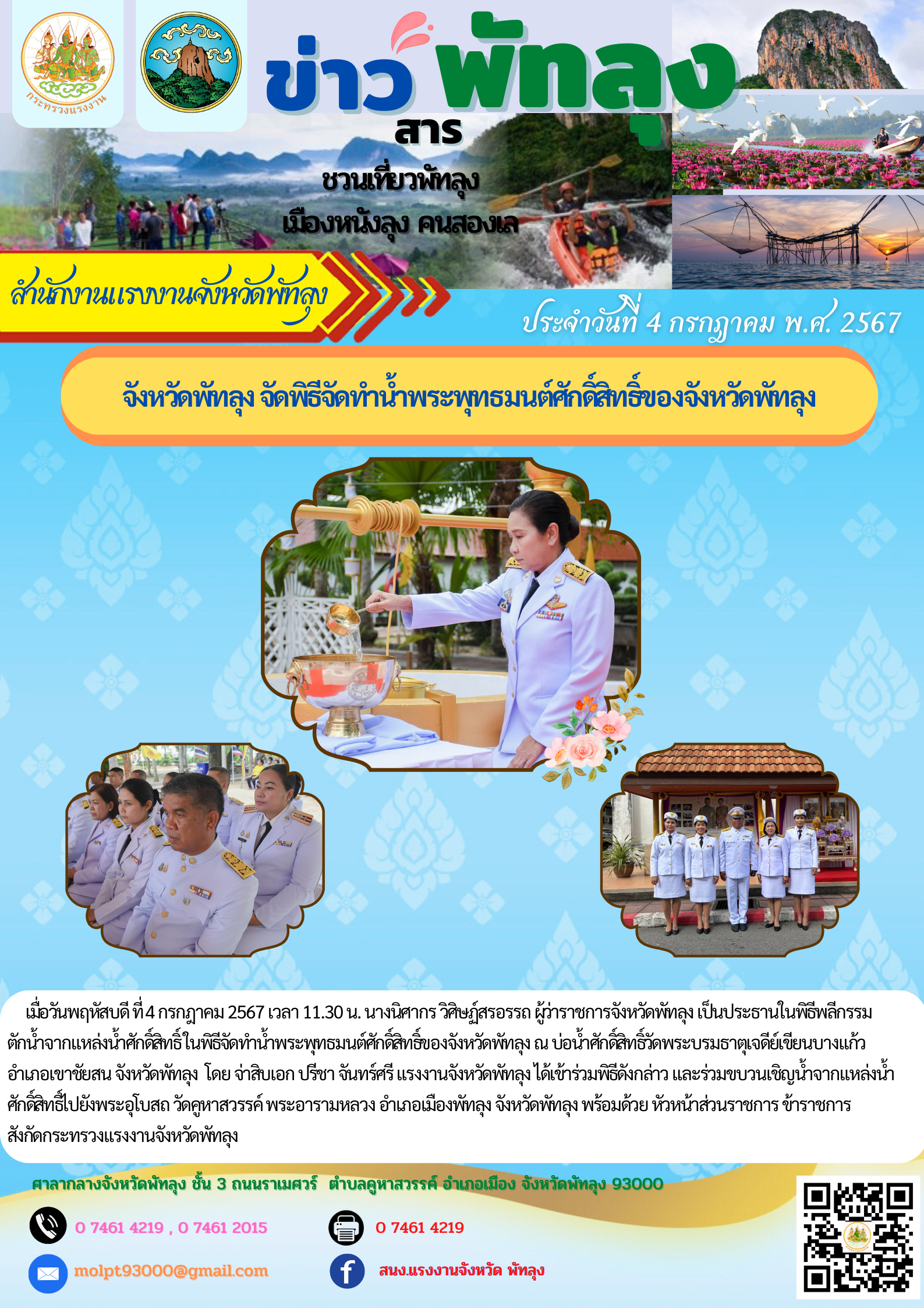 เมื่อวันพฤหัสบดี ที่ 4 กรกฎาคม 2567 เวลา 11.30 น. นางนิศากร วิศิษฏ์สรอรรถ ผู้ว่าราชการจังหวัดพัทลุง เป็นประธานในพิธีพลีกรรม ตักน้ำจากแหล่งน้ำศักดิ์สิทธิ์ ในพิธีจัดทำน้ำพระพุทธมนต์ศักดิ์สิทธิ์ของจังหวัดพัทลุง ณ บ่อน้ำศักดิ์สิทธิ์วัดพระบรมธาตุเจดีย์เขียนบางแก้ว อำเภอเขาชัยสน จังหวัดพัทลุง โดย จ่าสิบเอก ปรีชา จันทร์ศรี แรงงานจังหวัดพัทลุง ได้เข้าร่วมพิธีดังกล่าว และร่วมขบวนเชิญน้ำจากแหล่งน้ำศักดิ์สิทธิ์ไปยังพระอุโบสถ วัดคูหาสวรรค์ พระอารามหลวง อำเภอเมืองพัทลุง จังหวัดพัทลุง พร้อมด้วย หัวหน้าส่วนราชการ ข้าราชการ สังกัดกระทรวงแรงงานจังหวัดพัทลุง