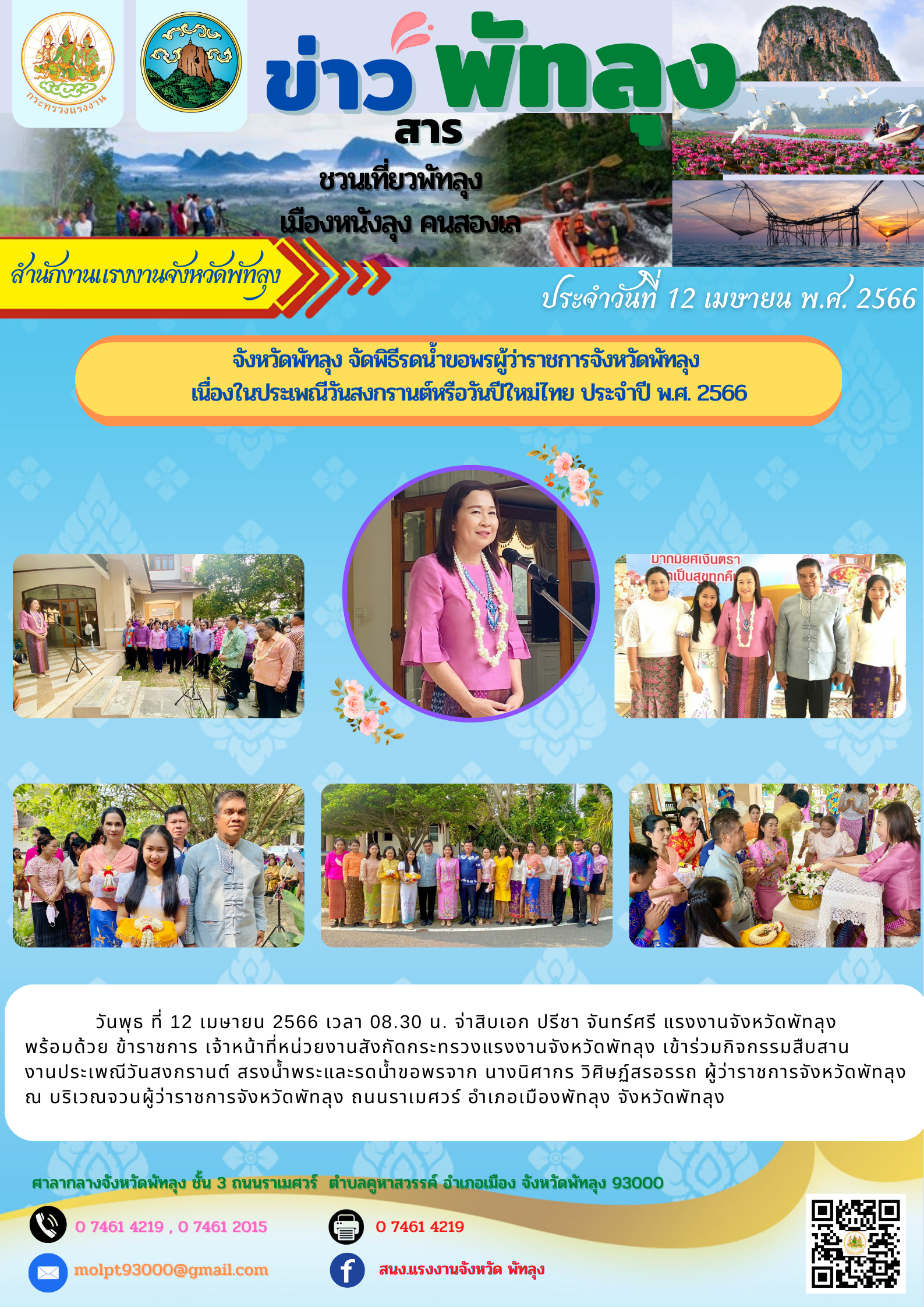 วันพุธ ที่ 12 เมษายน 2566 เวลา 08.30 น. จ่าสิบเอก ปรีชา จันทร์ศรี แรงงานจังหวัดพัทลุง พร้อมด้วย ข้าราชการ เจ้าหน้าที่หน่วยงานสังกัดกระทรวงแรงงานจังหวัดพัทลุง เข้าร่วมกิจกรรมสืบสาน งานประเพณีวันสงกรานต์ สรงน้ำพระและรดน้ำขอพรจาก นางนิศากร วิศิษฏ์สรอรรถ ผู้ว่าราชการจังหวัดพัทลุง ณ บริเวณจวนผู้ว่าราชการจังหวัดพัทลุง ถนนราเมศวร์ อำเภอเมืองพัทลุง จังหวัดพัทลุง