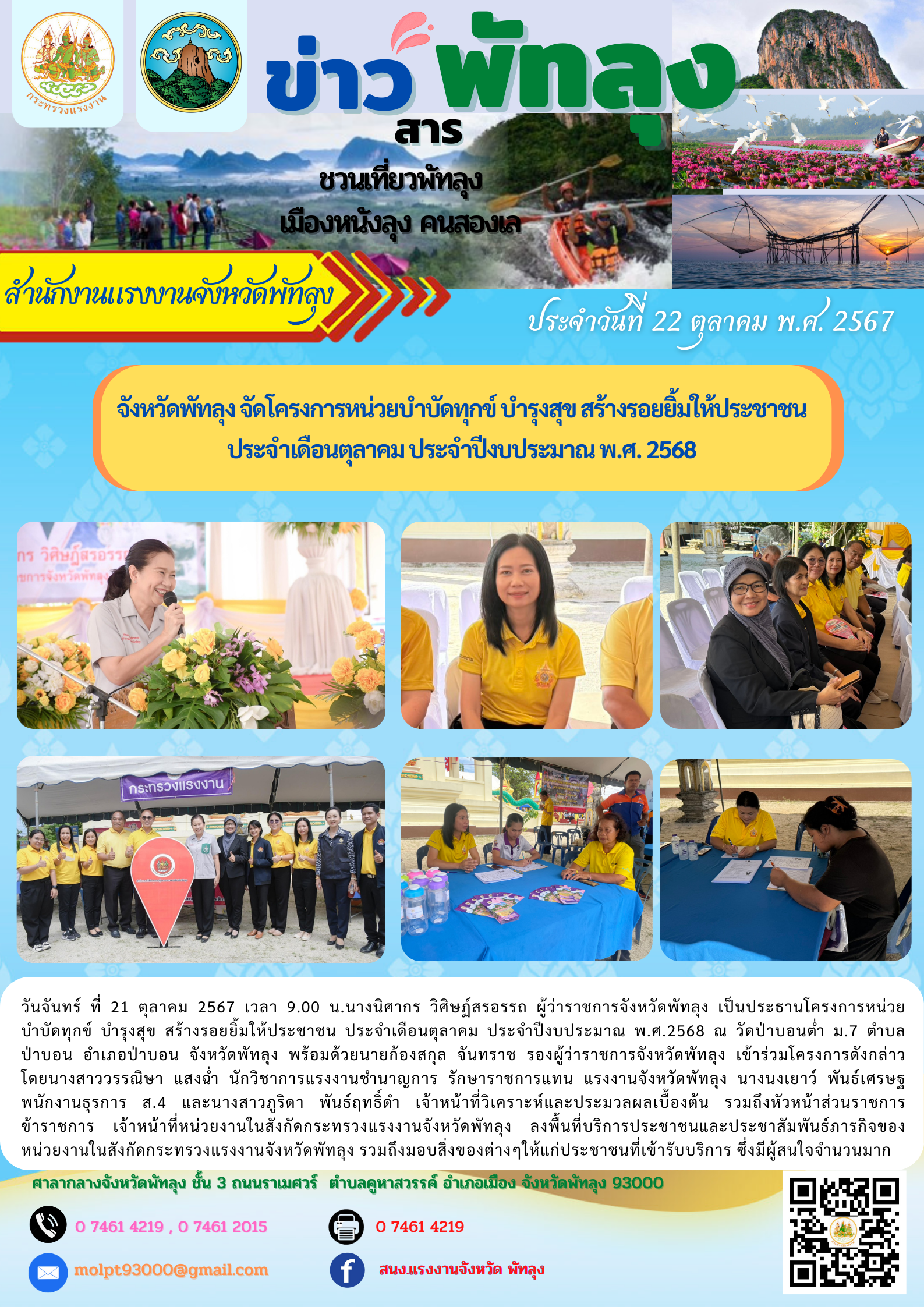 วันจันทร์ ที่ 21 ตุลาคม 2567 เวลา 9.00 น.นางนิศากร วิศิษฏ์สรอรรถ ผู้ว่าราชการจังหวัดพัทลุง เป็นประธานโครงการหน่วยบำบัดทุกข์ บำรุงสุข สร้างรอยยิ้มให้ประชาชน ประจำเดือนตุลาคม ประจำปีงบประมาณ พ.ศ.2568 ณ วัดป่าบอนต่ำ ม.7 ตำบล ป่าบอน อำเภอป่าบอน จังหวัดพัทลุง พร้อมด้วยนายก้องสกุล จันทราช รองผู้ว่าราชการจังหวัดพัทลุง เข้าร่วมโครงการดังกล่าว โดยนางสาววรรณิษา แสงฉ่ำ นักวิชาการแรงงานชำนาญการ รักษาราชการแทน แรงงานจังหวัดพัทลุง นางนงเยาว์ พันธ์เศรษฐ พนักงานธุรการ ส.4 และนางสาวภูริดา พันธ์ฤทธิ์ดำ เจ้าหน้าที่วิเคราะห์และประมวลผลเบื้องต้น รวมถึงหัวหน้าส่วนราชการ ข้าราชการ เจ้าหน้าที่หน่วยงานในสังกัดกระทรวงแรงงานจังหวัดพัทลุง ลงพื้นที่บริการประชาชนและประชาสัมพันธ์ภารกิจของหน่วยงานในสังกัดกระทรวงแรงงานจังหวัดพัทลุง รวมถึงมอบสิ่งของต่างๆให้แก่ประชาชนที่เข้ารับบริการ ซึ่งมีผู้สนใจจำนวนมาก