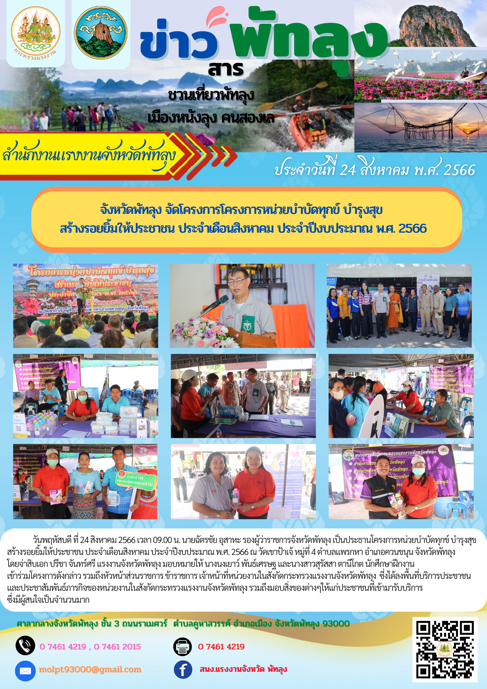 วันพฤหัสบดี ที่ 24 สิงหาคม 2566 เวลา 09.00 น. นายฉัตรชัย อุสาหะ รองผู้ว่าราชการจังหวัดพัทลุง เป็นประธานโครงการหน่วยบำบัดทุกข์ บำรุงสุข สร้างรอยยิ้มให้ประชาชน ประจำเดือนสิงหาคม ประจำปีงบประมาณ พ.ศ. 2566 ณ วัดเขาป้าเจ้ หมู่ที่ 4 ตำบลแพรกหา อำเภอควนขนุน จังหวัดพัทลุง โดยจ่าสิบเอก ปรีชา จันทร์ศรี แรงงานจังหวัดพัทลุง มอบหมายให้ นางนงเยาว์ พันธ์เศรษฐ และนางสาวสุรัสสา ตานีโกต นักศึกษาฝึกงาน เข้าร่วมโครงการดังกล่าว รวมถึงหัวหน้าส่วนราชการ ข้าราชการ เจ้าหน้าที่หน่วยงานในสังกัดกระทรวงแรงงานจังหวัดพัทลุง ซึ่งได้ลงพื้นที่บริการประชาชน และประชาสัมพันธ์ภารกิจของหน่วยงานในสังกัดกระทรวงแรงงานจังหวัดพัทลุง รวมถึงมอบสิ่งของต่างๆให้แก่ประชาชนที่เข้ามารับบริการ ซึ่งมีผู้สนใจเป็นจำนวนมาก