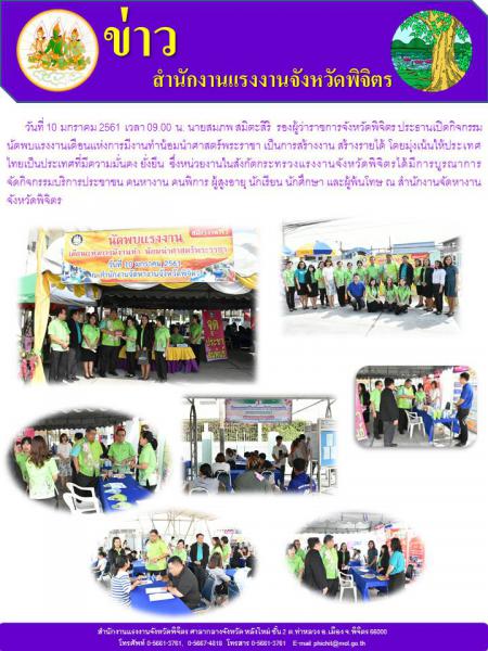 เมื่อวันที่ 10 มกราคม 2561 เวลา 09.00 น. นายสมภพ สมิตะสิริ รองผู้ว่าราชการจังหวัดพิจิตร ประธานเปิดกิจกรรมนัดพบแรงงานเดือนแห่งการมีงานทำน้อมนำศาสตร์พระราชา เป็นการสร้างงาน สร้างรายได้ โดยมุ่งเน้นให้ประเทศไทยเป็นประเทศที่มีความมั่นคง ยั่งยืน ซึ่งหน่วยงานในสังกัดกระทรวงแรงงานจังหวัดพิจิตรได้มีการบูรณาการจัดกิจกรรมบริการประชาชน คนหางาน คนพิการ ผู้สูงอายุ นักเรียน นักศึกษา และผู้พ้นโทษ ณ สำนักงานจัดหางานจังหวัดพิจิตร