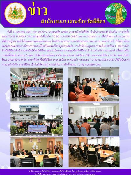 วันที่ 17 มกราคม 2561 เวลา 08.30 น. นายมนต์ชัย เดชพล แรงงานจังหวัดพิจิตร ดำเนินการรณรงค์ ส่งเสริม การจัดตั้งชมรม TO BE NUMBER ONE และศูนย์เพื่อนใจ TO BE NUMBER ONE ในสถานประกอบการ เพื่อให้สถานประกอบการได้มีความรู้ ความเข้าใจในเจตนารมณ์ของโครงการ โดยมีหัวหน้าส่วนราชการสังกัดกระทรวงแรงงาน และเจ้าหน้าที่ที่เกี่ยวข้อง ตลอดจนคณะกรรมการโครงการรณรงค์ป้องกันและแก้ไขปัญหายาเสพติด จากสำนักงานอุตสาหกรรมจังหวัดพิจิตร หอการค้าจังหวัดพิจิตร สำนักงานพาณิชย์จังหวัดพิจิตร และ สำนักงานสาธารณสุขจังหวัดพิจิตร เข้าร่วมดำเนินการรณรงค์ เพื่อส่งเสริมการจัดตั้งชมรม จำนวน 3 แห่ง บริษัท สยามแม๊คโคร จำกัด (มหาชน) สาขาพิจิตร บริษัท สหแพทย์พิจิตร จำกัด และบริษัท อินเว ประเทศไทย จำกัด สาขาพิจิตร ซึ่งได้ได้รับความร่วมมือจากคณะทำงานชมรม TO BE NUMBER ONE บริษัทนันยางการเมนท์ จำกัด สาขาพิจิตร เข้าร่วมให้ความรู้ ความเข้าใจ การจัดตั้งชมรม TO BE NUMBER ONE