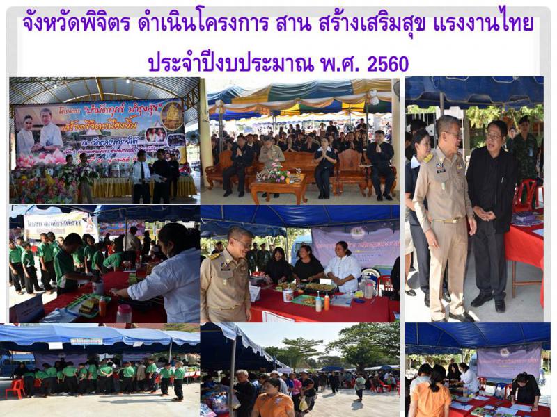 วันที่ 22 กุมภาพันธ์ 2560 นายวีระศักดิ์ วิจิตร์แสงศรี ผู้ว่าราชการจังหวัดพิจิตร รองผู้ว่าราชการจังหวัด นายกเหล่ากาชาด หัวหน้าส่วนราชการในจังหวัด พร้อมด้วยข้าราชการ พนักงาน เจ้าหน้าที่ ออกให้บริการประชาชนตามโครงการ “บำบัดทุกข์ บำรุงสุข สร้างพิจิตรเมืองยิ้ม” ณ วัดคลองทรายใต้ หมู่ที่ 2 ตำบลหนองหญ้าไทร อำเภอสากเหล็ก ซึ่งนายมนต์ชัย เดชพล แรงงานจังหวัดพิจิตร และเจ้าหน้าที่สำนักงานแรงงานจังหวัดพิจิตร นำบริการโครงการ สาน สร้างเสริมสุข แรงงานไทย สาธิตการประกอบอาชีพอิสระการทำปังสเต๊ะ ให้บริการประชาชน โดยมีอาสาสมัครแรงงานในพื้นที่อำเภอสากเหล็กเข้าร่วมกิจกรรมด้วย และหน่วยงานสังกัดกระทรวงแรงงานในจังหวัดพิจิตร ได้นำบริการด้านแรงงานมาให้บริการในครั้งนี้ด้วย