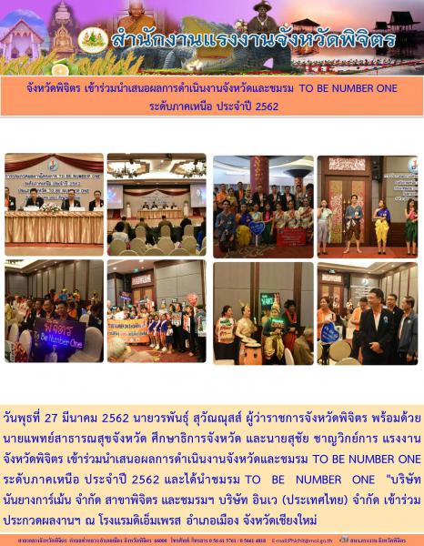 วันพุธที่ 27 มีนาคม 2562 นายวรพันธุ์ สุวัณณุสส์ ผู้ว่าราชการจังหวัดพิจิตร พร้อมด้วยนายแพทย์สาธารณสุขจังหวัด ศึกษาธิการจังหวัด และนายสุชัย ชาญวิกย์การ แรงงานจังหวัดพิจิตร เข้าร่วมนำเสนอผลการดำเนินงานจังหวัดและชมรม TO BE NUMBER ONE ระดับภาคเหนือ ประจำปี 2562 และได้นำชมรม TO BE NUMBER ONE “บริษัทนันยางการ์เม้น จำกัด สาขาพิจิตร และชมรมฯ บริษัท อินเว (ประเทศไทย) จำกัด เข้าร่วมประกวดผลงานฯ ณ โรงแรมดิเอ็มเพรส อำเภอเมือง จังหวัดเชียงใหม่