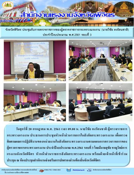 วันศุกร์ที่ 20 กรกฎาคม พ.ศ. 2561 เวลา 09.00 น. นายวิชัย คงรัตนชาติ ผู้ตรวจราชการกระทรวงแรงงาน ประธานการประชุมหัวหน้าส่วนราชการในสังกัดกระทรวงแรงงาน เพื่อตรวจติดตามผลการปฏิบัติงานของหน่วยงานในสังกัดกระทรวงแรงงานตามแผนการตรวจราชการของผู้ตรวจราชการกระทรวงแรงงาน ประจำปีงบประมาณ พ.ศ.2561 รอบที่ 3 โดยมีนายสุชัย ชาญวิกย์การ แรงงานจังหวัดพิจิตร หัวหน้าส่วนราชการสังกัดกระทรวงแรงงาน พร้อมด้วยเจ้าหน้าที่เข้าร่วมประชุม ณ ห้องประชุมสำนักงานส่งเสริมการปกครองส่วนท้องถิ่นจังหวัดพิจิตร