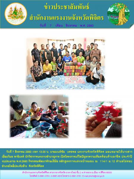 วันที่ 7 สิงหาคม 2560 เวลา 13.00 น. นายมนต์ชัย เดชพล แรงงานจังหวัดพิจิตร มอบหมายให้นางสาว เยี่ยมวิมล พาอินทร์ นักวิชาการแรงงานชำนาญการ เปิดโครงการแก้ไขปัญหาความเดือดร้อนด้านอาชีพ ประจำปีงบประมาณ พ.ศ.2560 กิจกรรมพัฒนาทักษะฝีมือ หลักสูตรการแต่งหน้าหมอน ณ 114/1 ม.12 ตำบลไผ่รอบ อำเภอโพธิ์ประทับช้าง จังหวัดพิจิตร