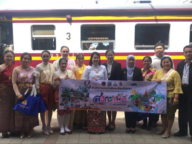 เมื่อวันพุธที่ 11 เมษายน 2561 เวลา 14.00 น. นางสุจินดา บุญแอ แรงงานจังหวัดยะลา นางกิตติพร มะนอ ประกันสังคมจังหวัดยะลา พร้อมด้วยข้าราชการและเจ้าหน้าที่ หน่วยงานสังกัดกระทรวงแรงงานจังหวัดยะลา ร่วมโครงการ "ส่งพี่น้องแรงงานกลับบ้านเทศกาลสงกรานต์ อย่างปลอดภัย" ณ สถานีรถไฟจังหวัดยะลา