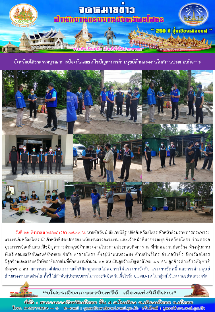 จังหวัดยโสธรตรวจบูรณาการป้องกันและแก้ไขปัญหาการค้ามนุษย์ด้านแรงงานในสถานประกอบกิจการ ในเขตพื้นที่อำเภอป่าติ้ว