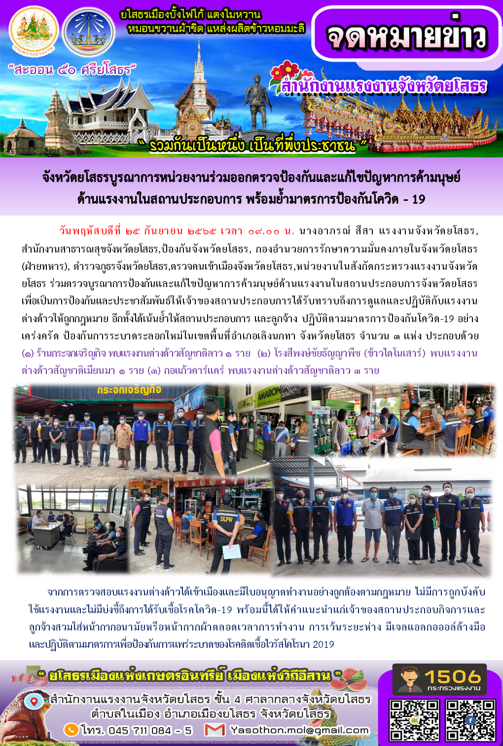 จังหวัดยโสธรบูรณาการหน่วยงานร่วมออกตรวจป้องกันและแก้ไขปัญหาการค้ามนุษย์ ด้านแรงงานในสถานประกอบการ พร้อมย้ำมาตรการป้องกันโควิด – 19