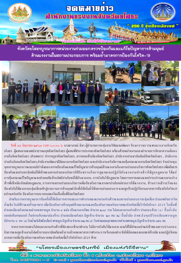 จังหวัดยโสธร บูรณาการหน่วยงานร่วมออกตรวจป้องกันและแก้ไขปัญหาการค้ามนุษย์ ด้านแรงงานในสถานประกอบการ พร้อมย้ำมาตรการป้องกันโควิด-19